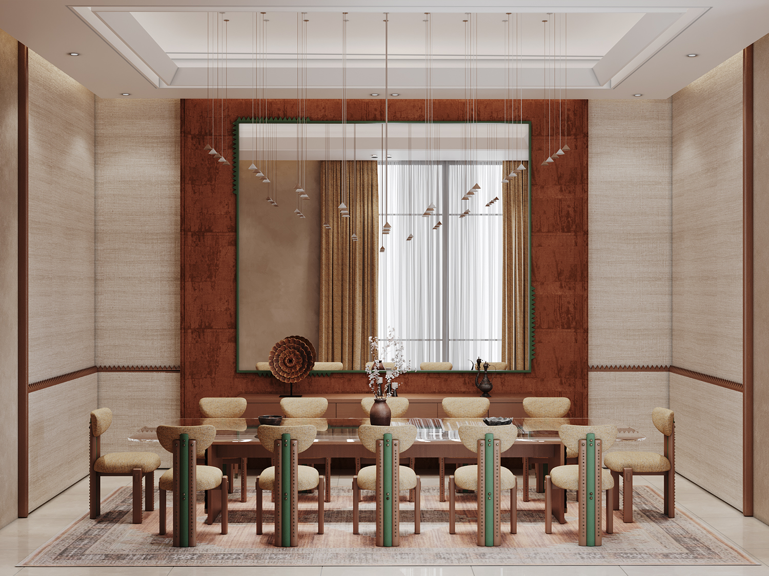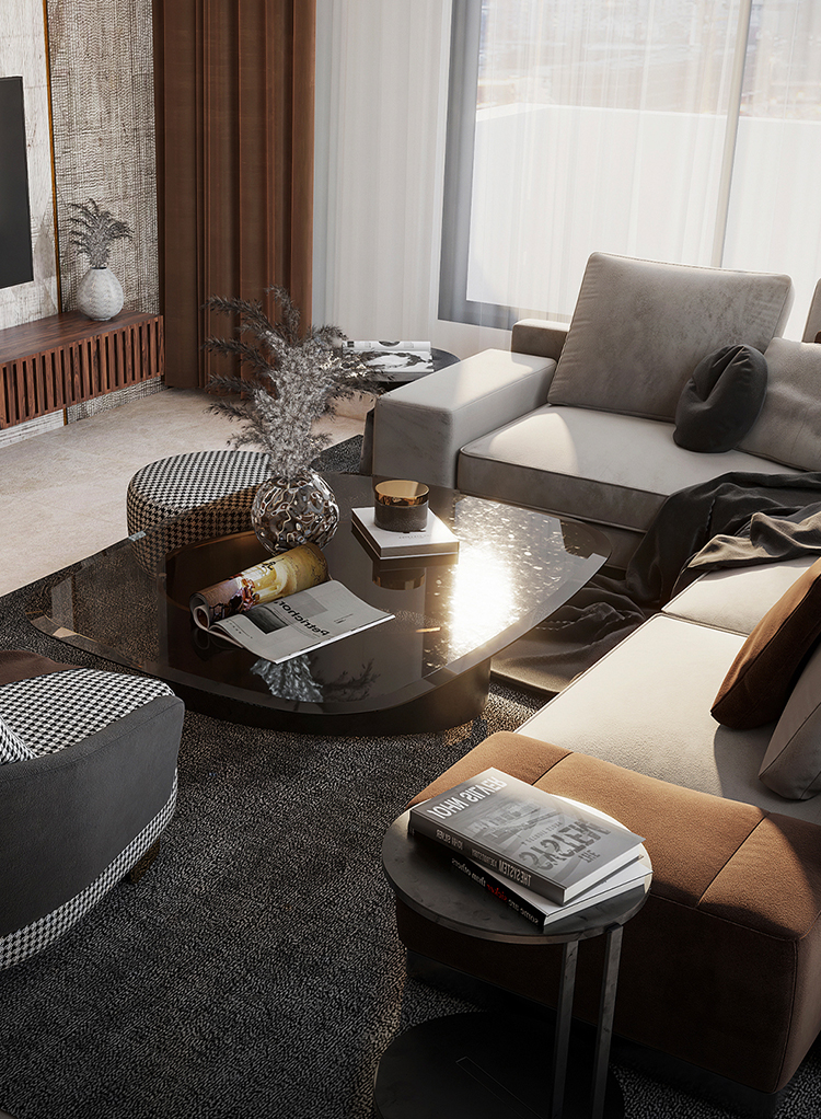 Harmony and elegance define the Al Amareah project, inspired by a boho aesthetic. A carefully curated palette of earthy tones, crisp whites, and warm beiges forms a calm and balanced foundation, enriched by green armchairs that bring life and depth to the space.