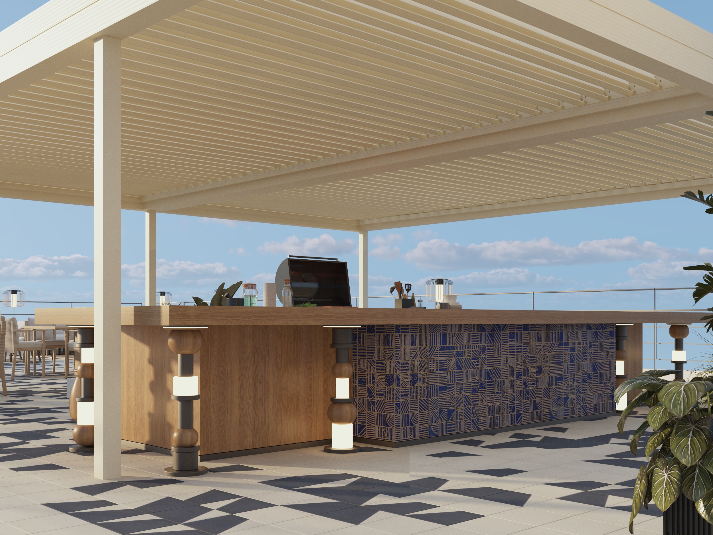 The rooftop bar is the heart of the project. Designed with Salmani sensibilities, it blends Saudi ornamentation with Mediterranean clarity, creating a centerpiece of texture, form, and identity.