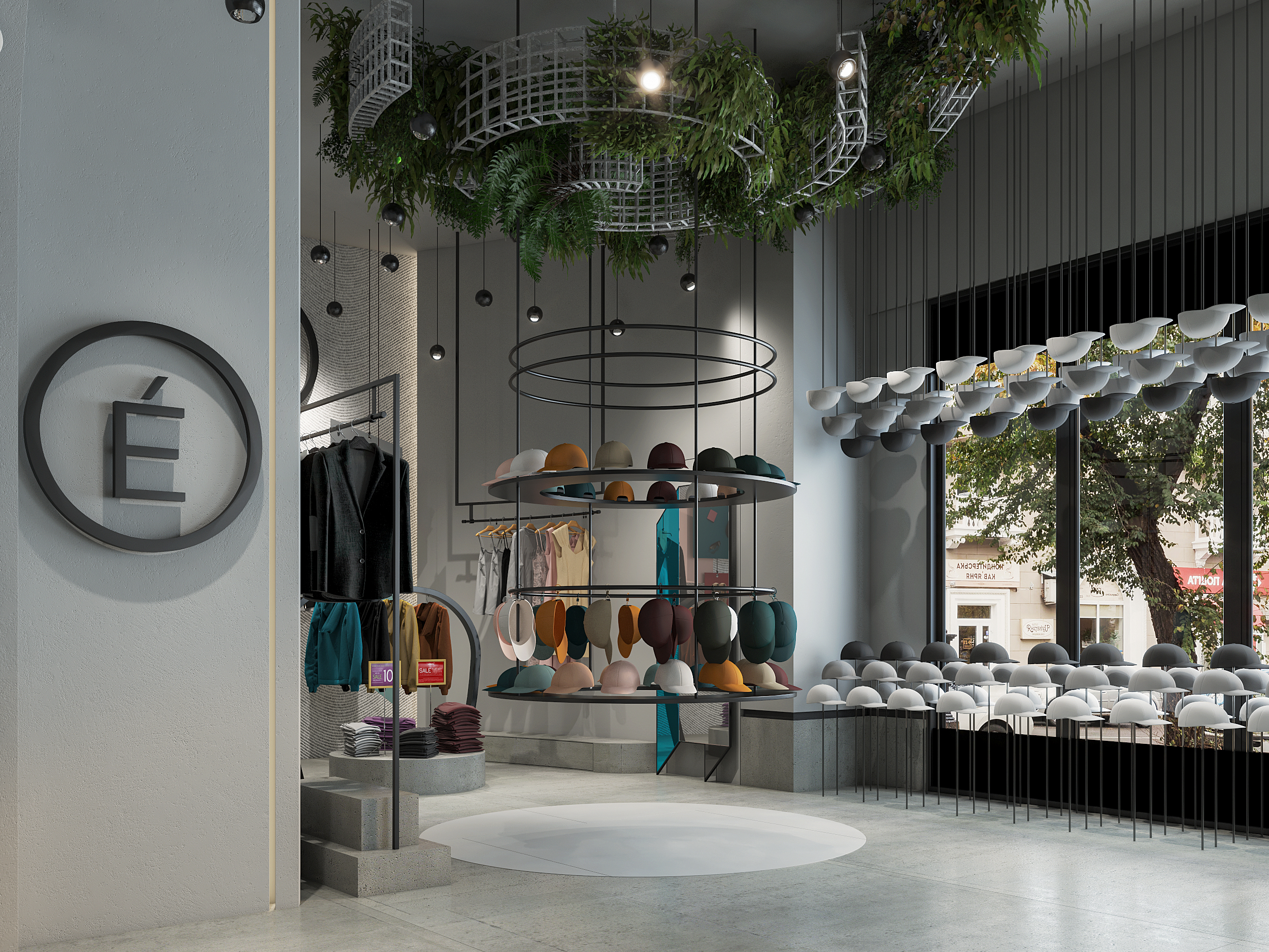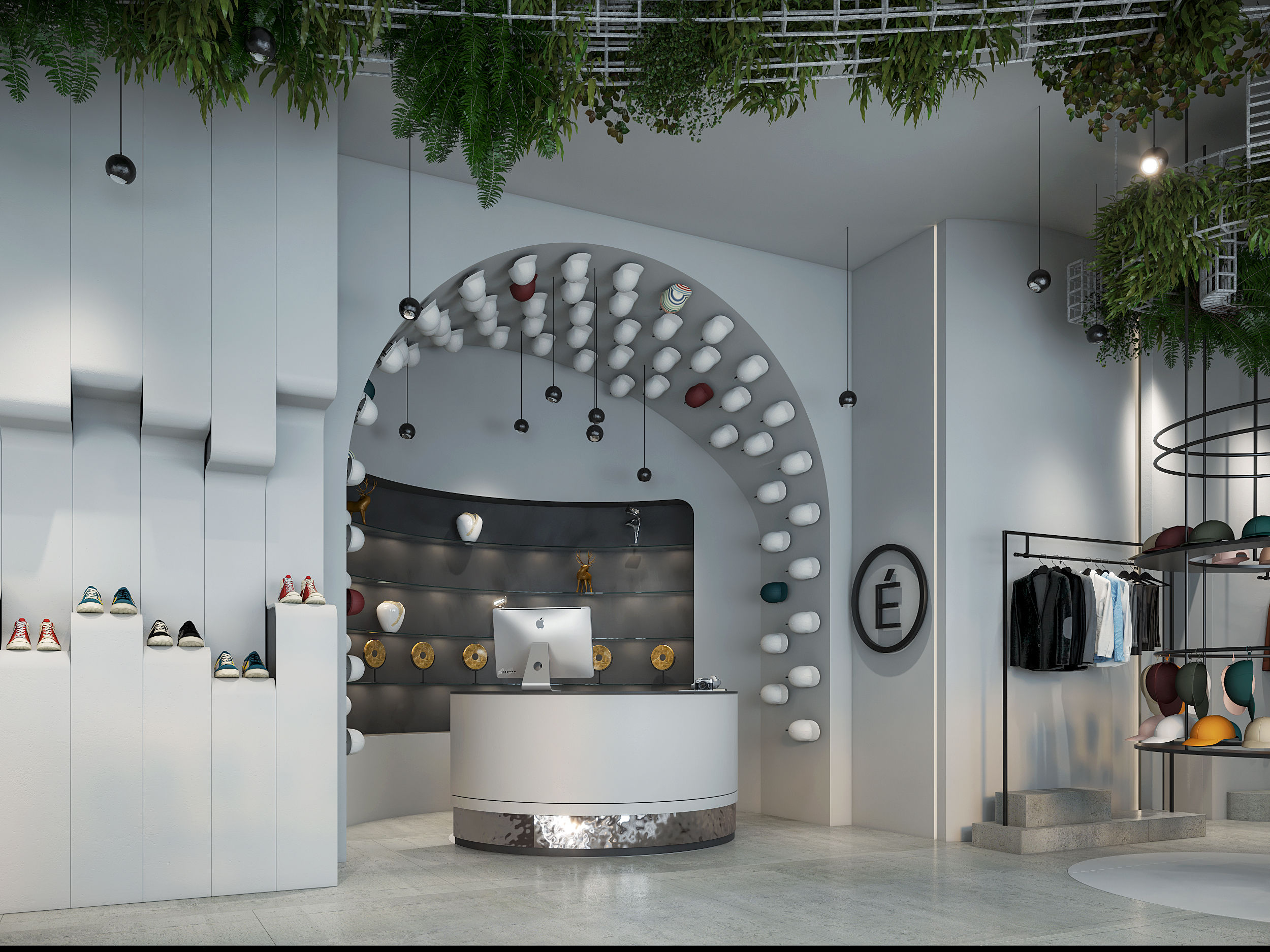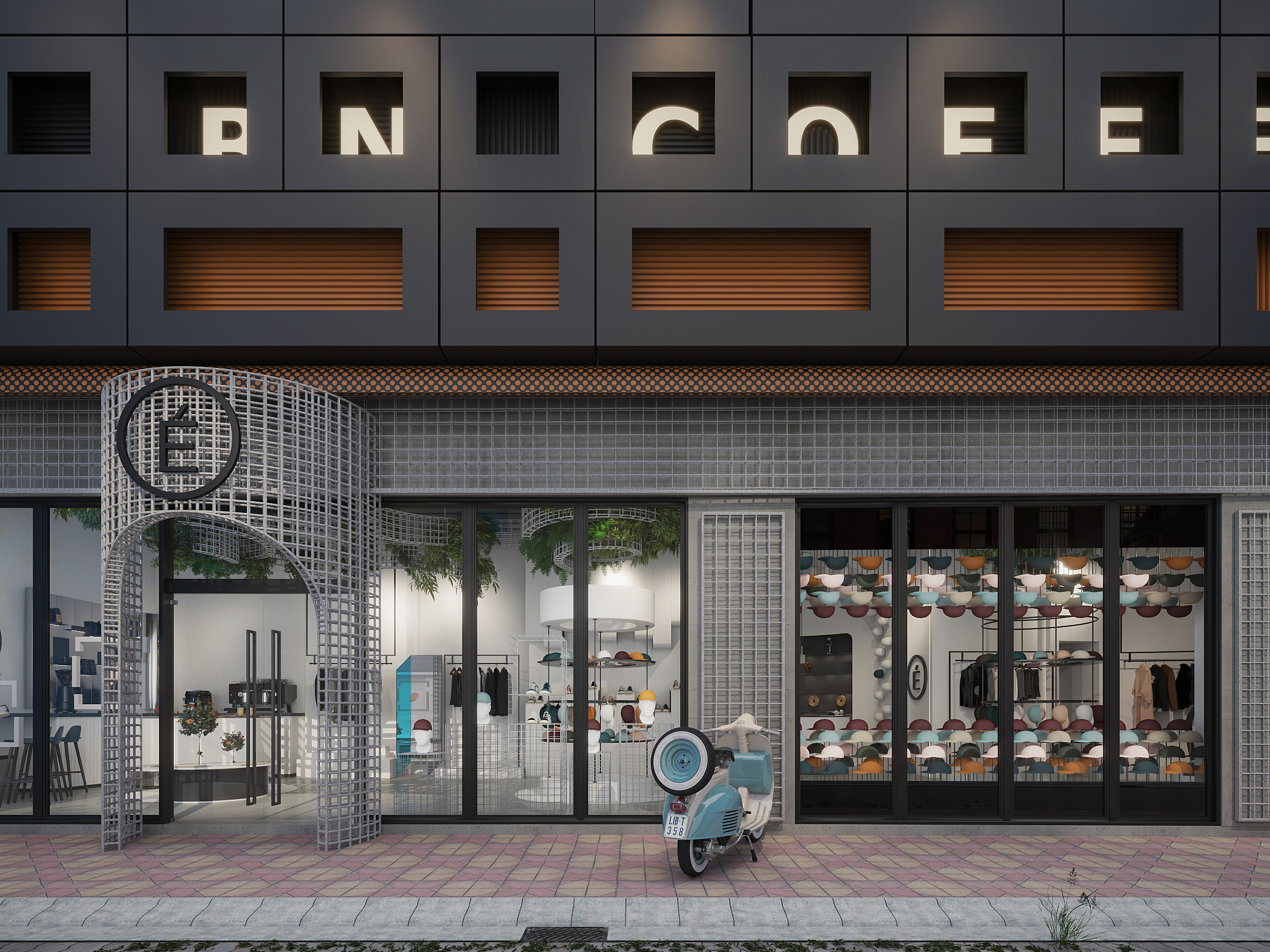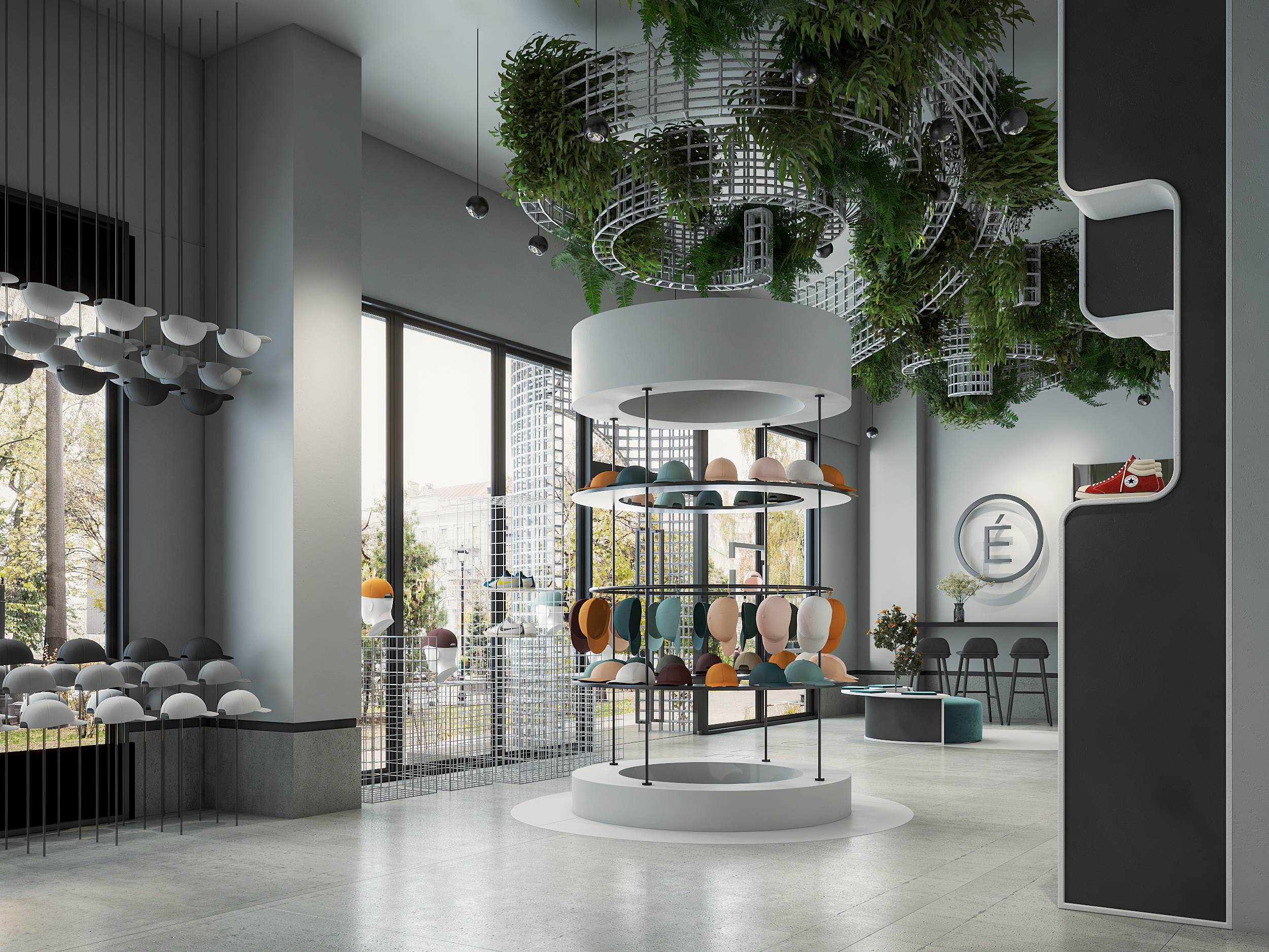 A Lifestyle Experience The interior concept translates the brand’s twisted bow, featured on their signature hat design, into architectural details, guiding the flow from entrance to lounge, multibrand displays, and the in-store coffee bar.