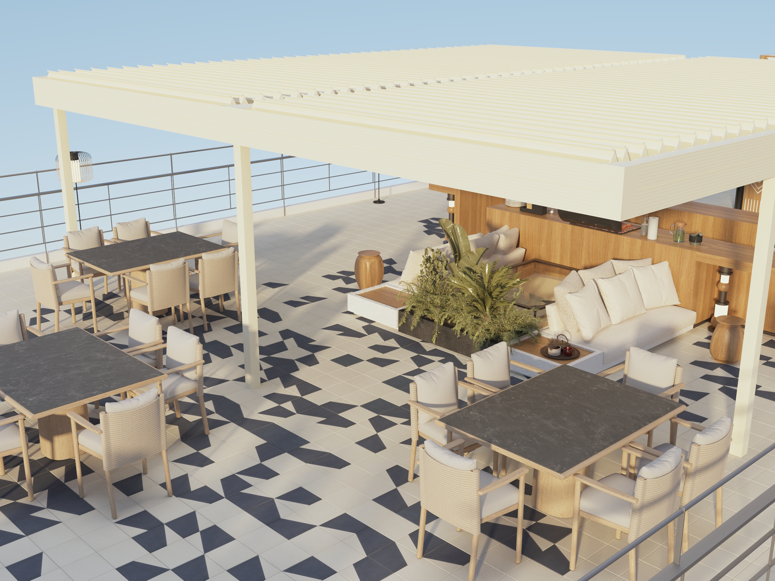 This rooftop café/bar is more than a space; it is a story of identity, memory, and design. Inspired by my journey between Saudi Arabia and summers in Greece, the design reflects heritage and personal nostalgia.