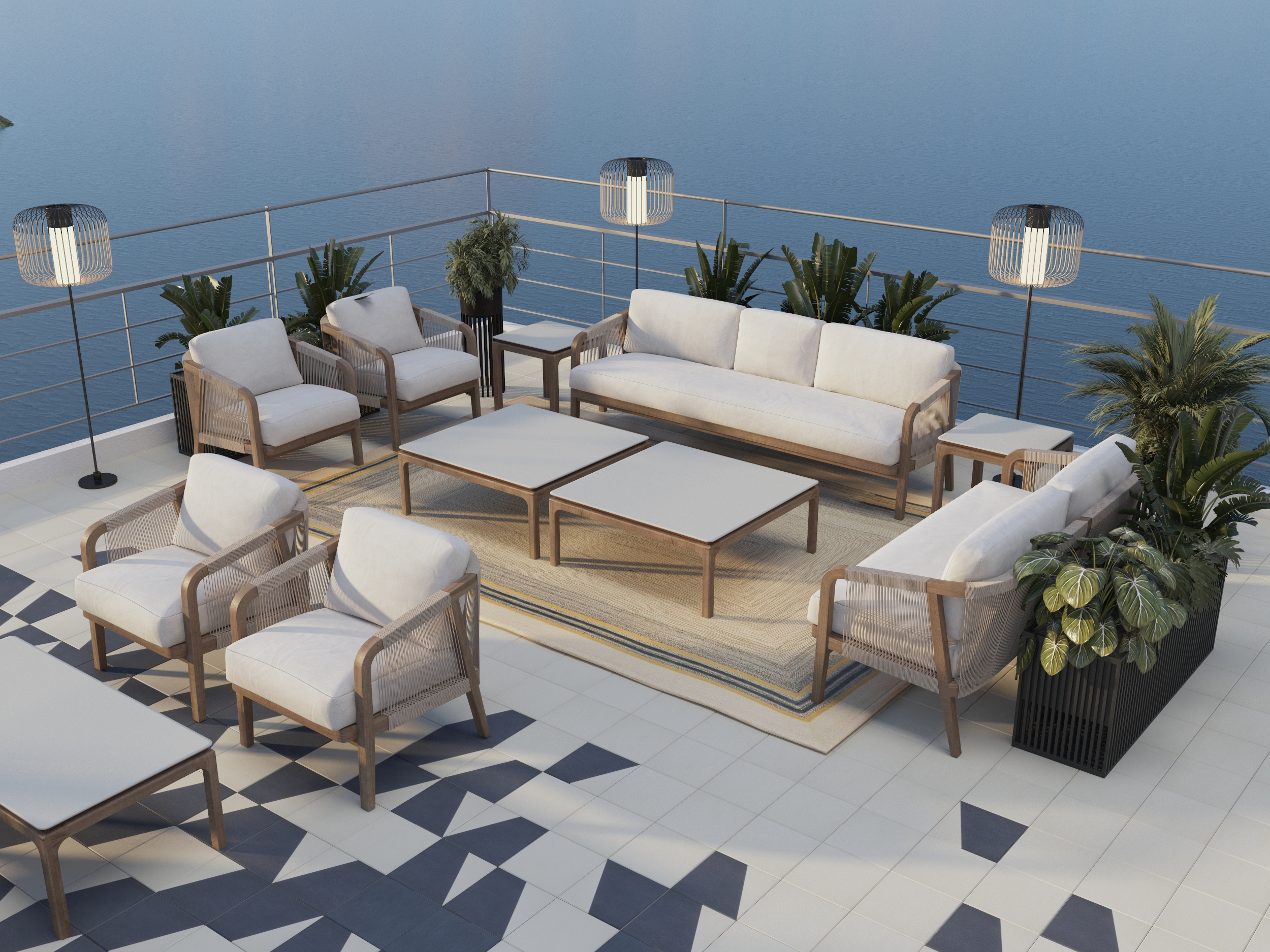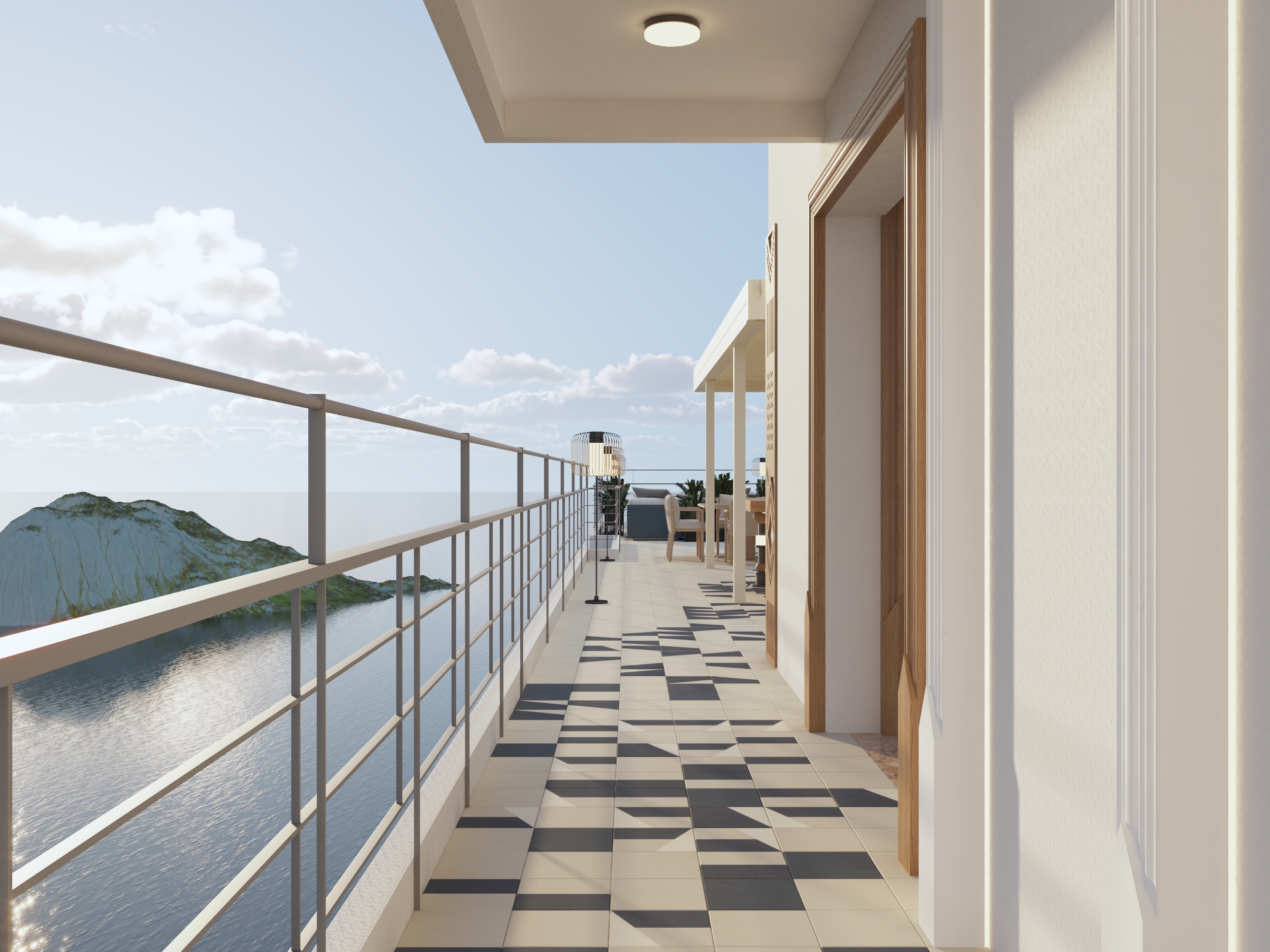 Salmani design, our studio’s reinterpretation of late-century modernism rooted in Saudi tradition, forms the backbone of the space. Crisp Aegean whites and deep blues create balance and contrast, while the bar stands as the heart of the rooftop, a sculptural centerpiece where Mediterranean minimalism meets Najdi ornamentation.
