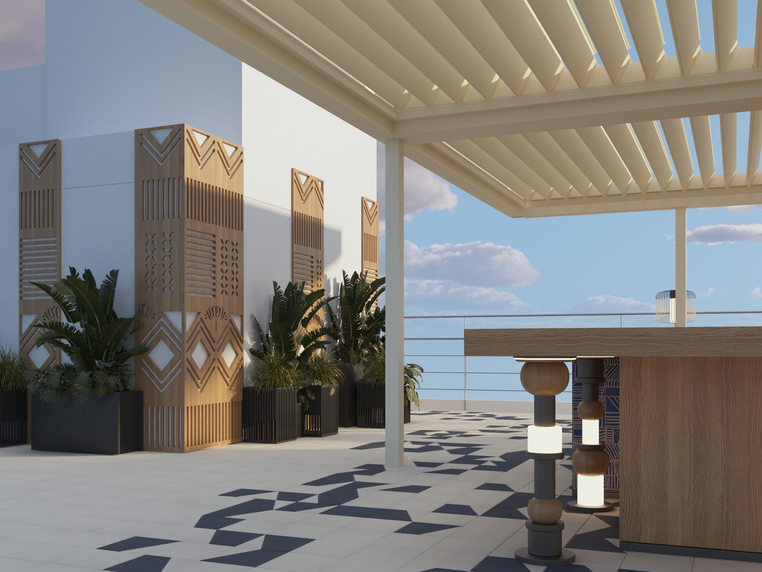 The rooftop bar is the heart of the project. Designed with Salmani sensibilities, it blends Saudi ornamentation with Mediterranean clarity, creating a centerpiece of texture, form, and identity.