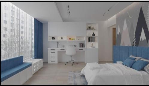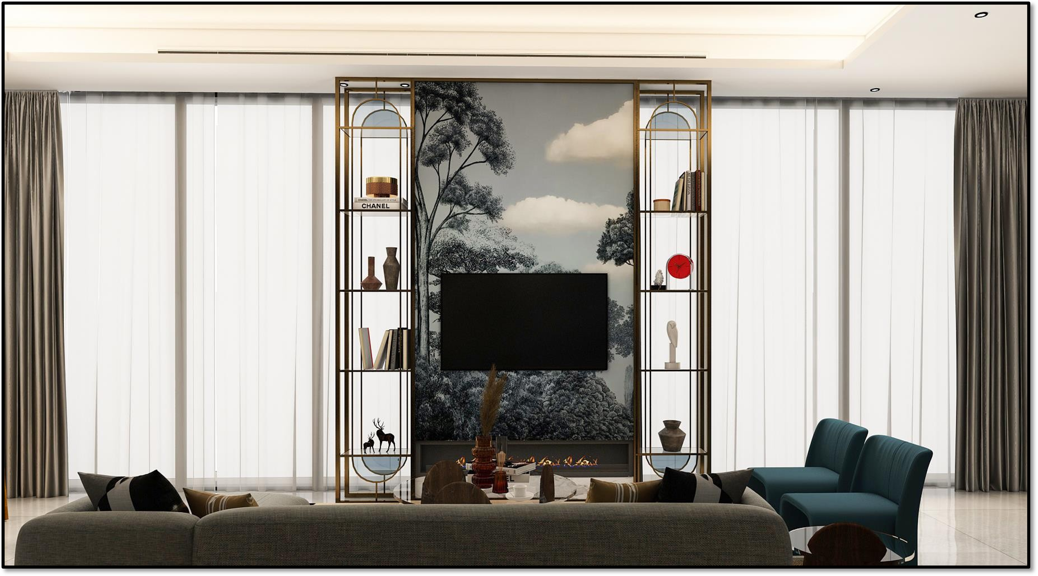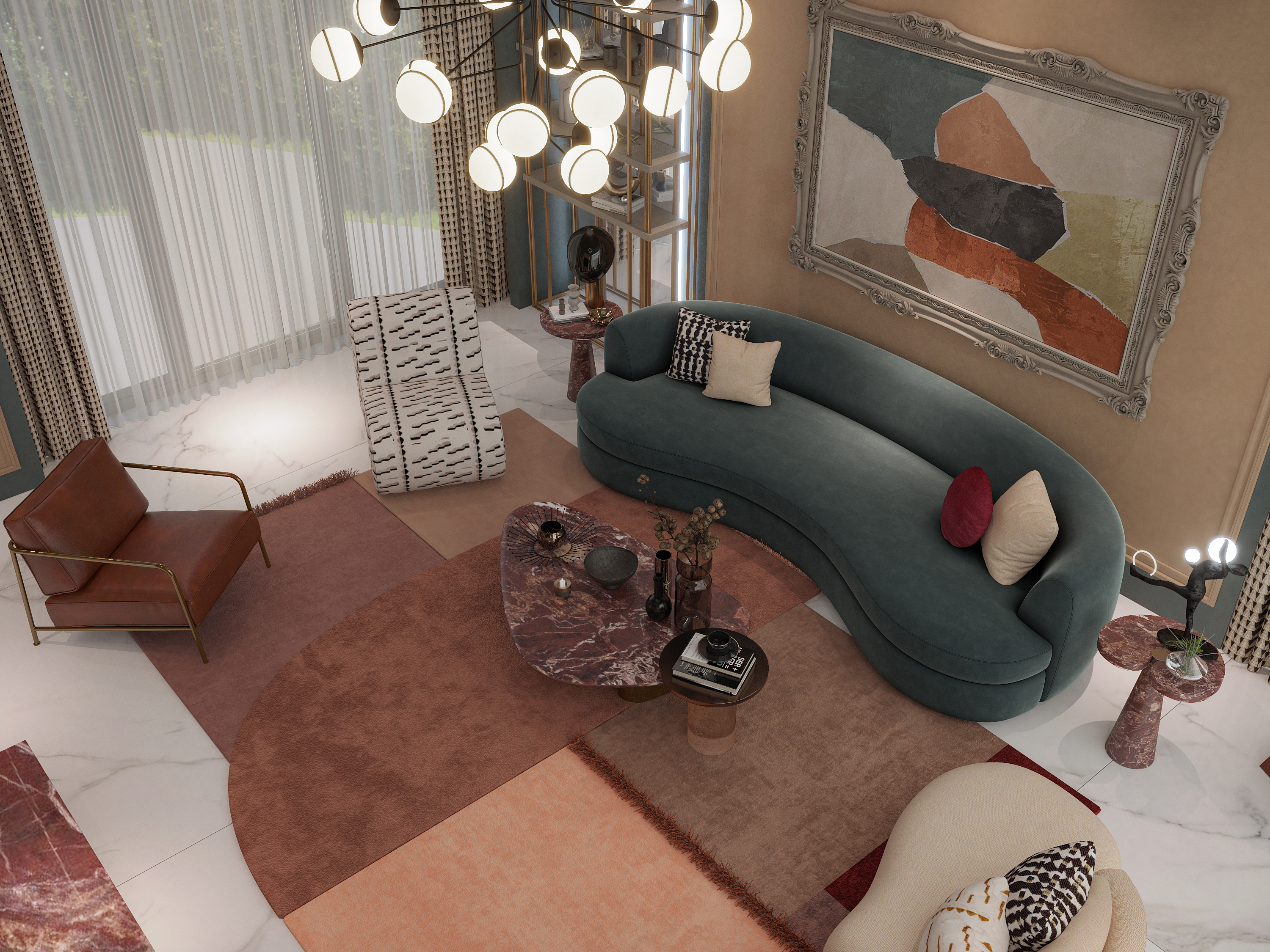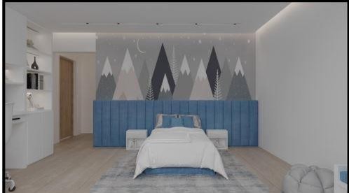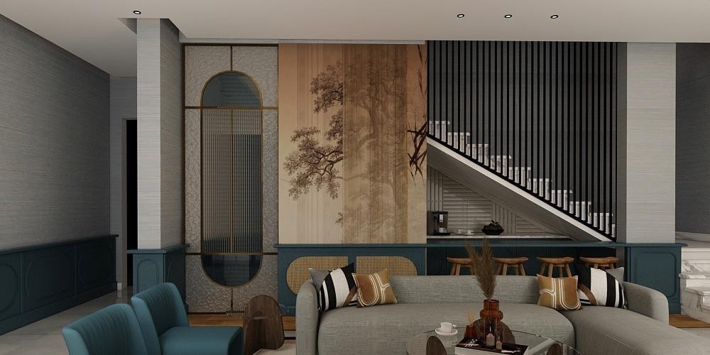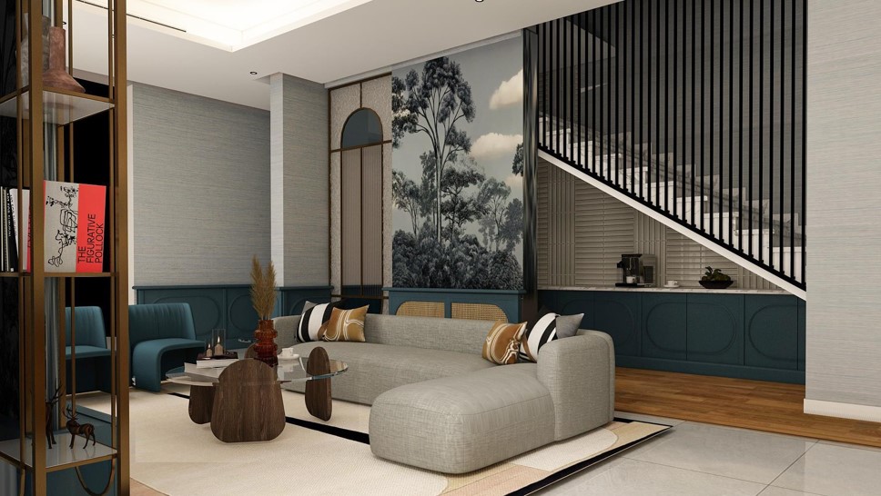 Harmony and elegance define the Al Amareah project, inspired by a boho aesthetic. A carefully curated palette of earthy tones, crisp whites, and warm beiges forms a calm and balanced foundation, enriched by green armchairs that bring life and depth to the space.