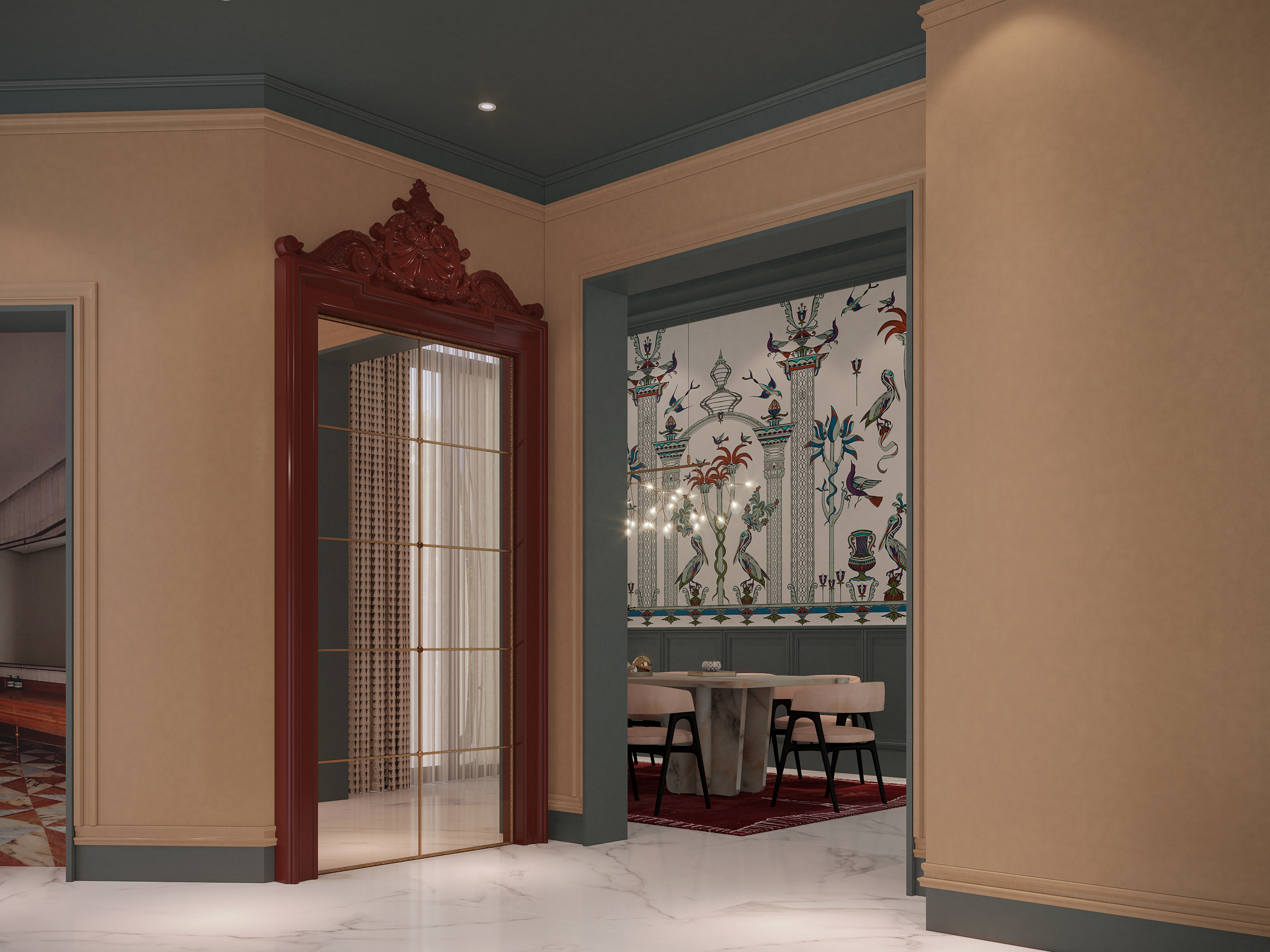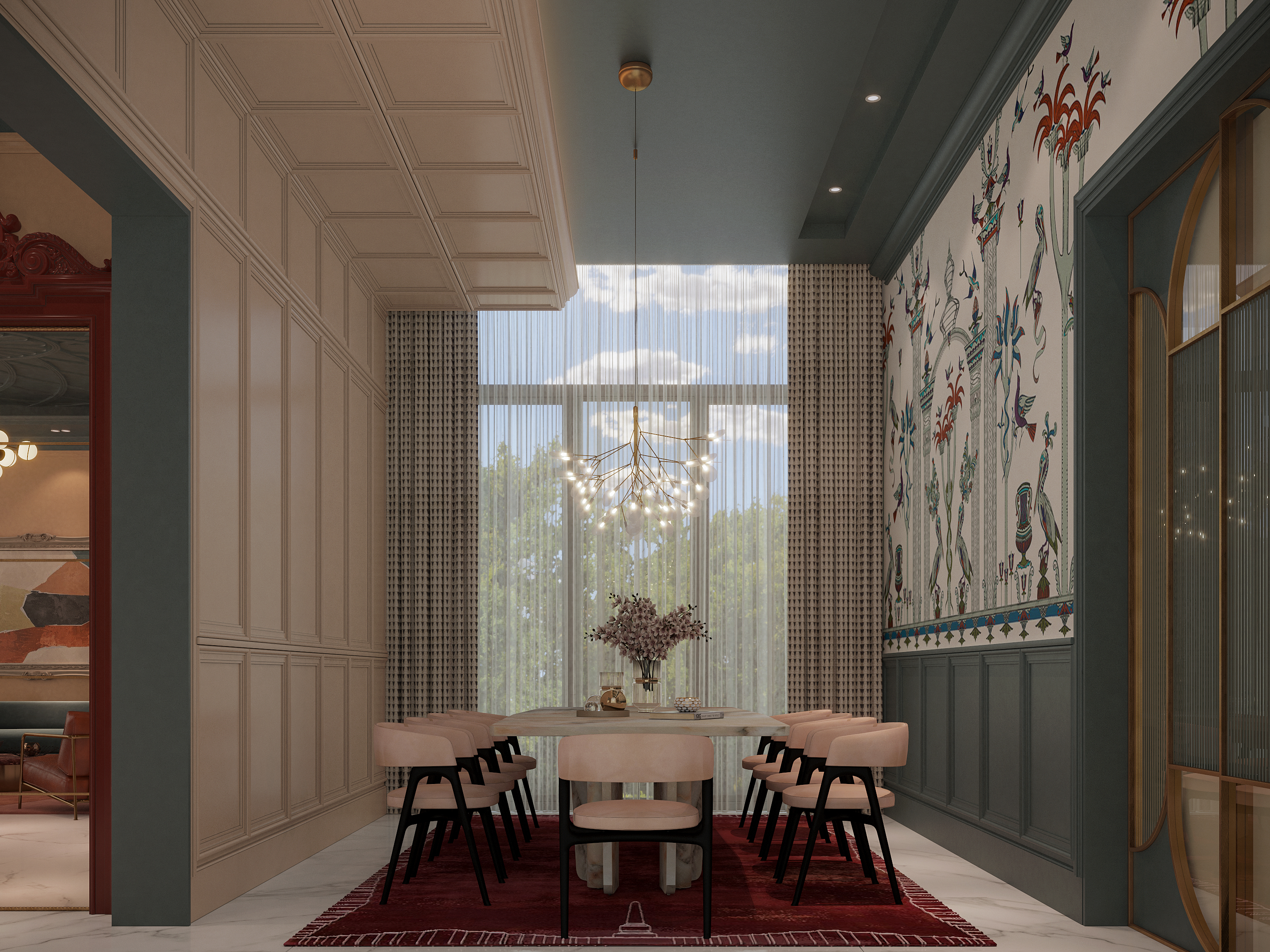 A custom Venetian-inspired sliding glass door separates the salon from the dining area, where the existing AC ducting and ceiling shapes informed an asymmetric design, creating balance with clever visual framing around the garden view.