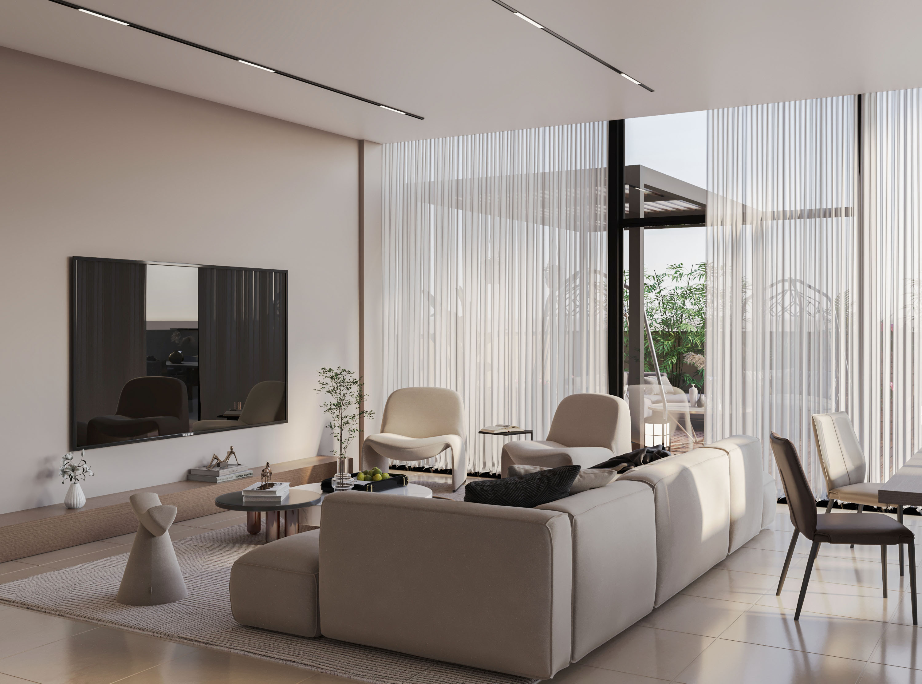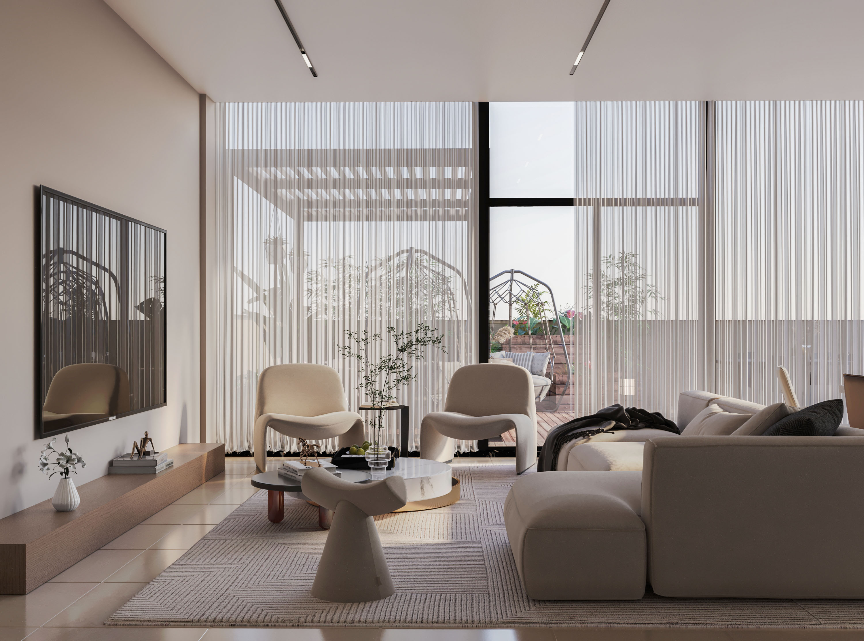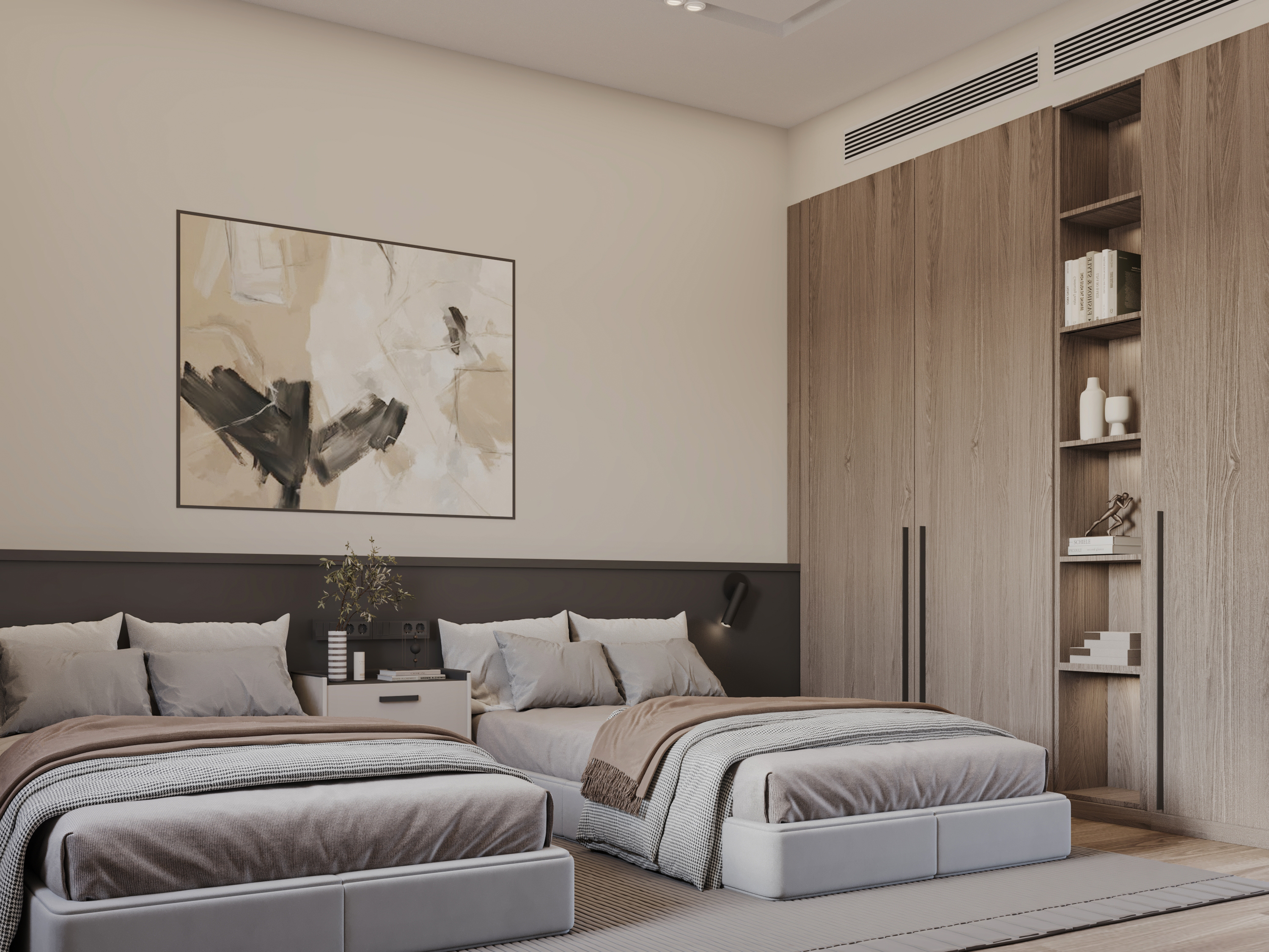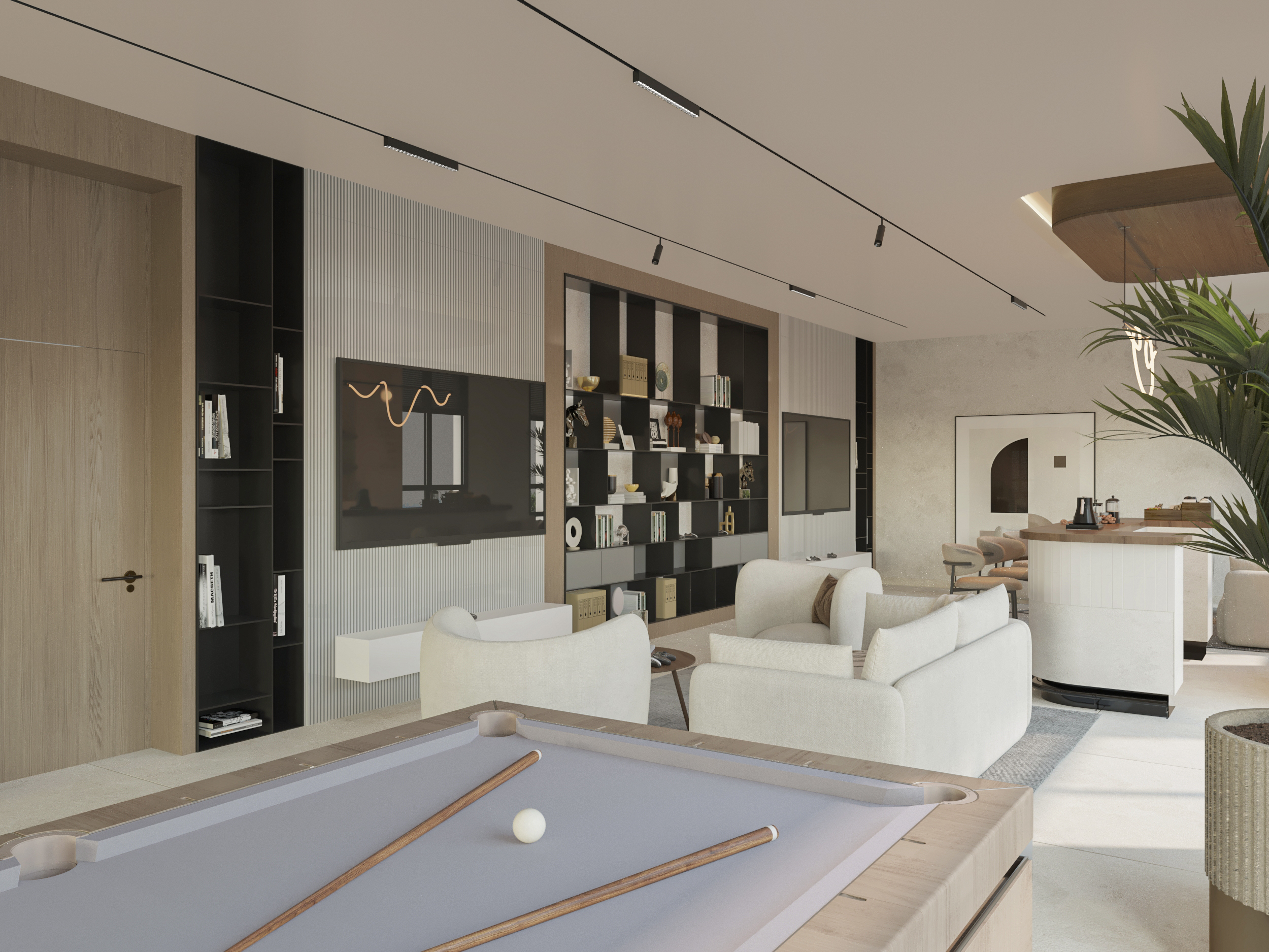 Harmony and elegance define the Al Amareah project, inspired by a boho aesthetic. A carefully curated palette of earthy tones, crisp whites, and warm beiges forms a calm and balanced foundation, enriched by green armchairs that bring life and depth to the space.