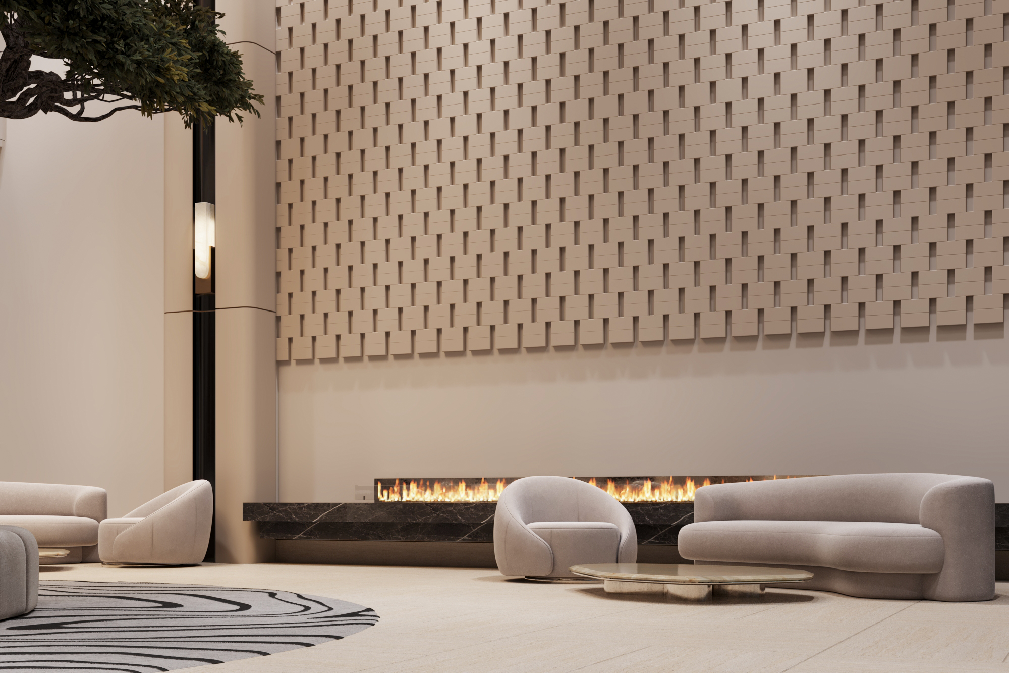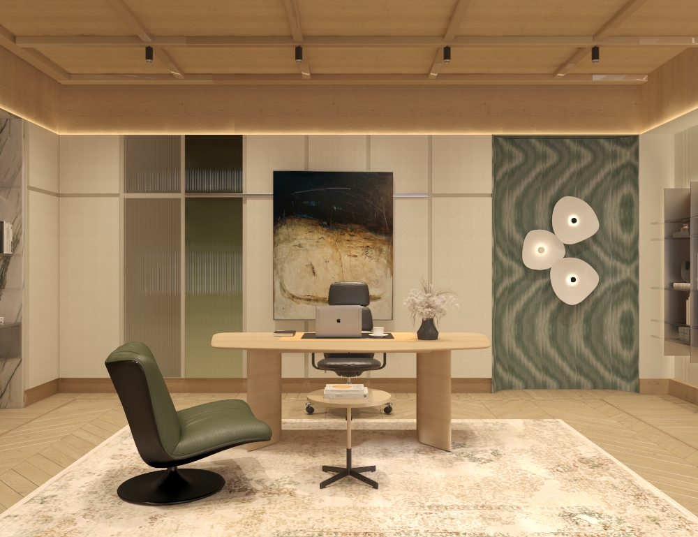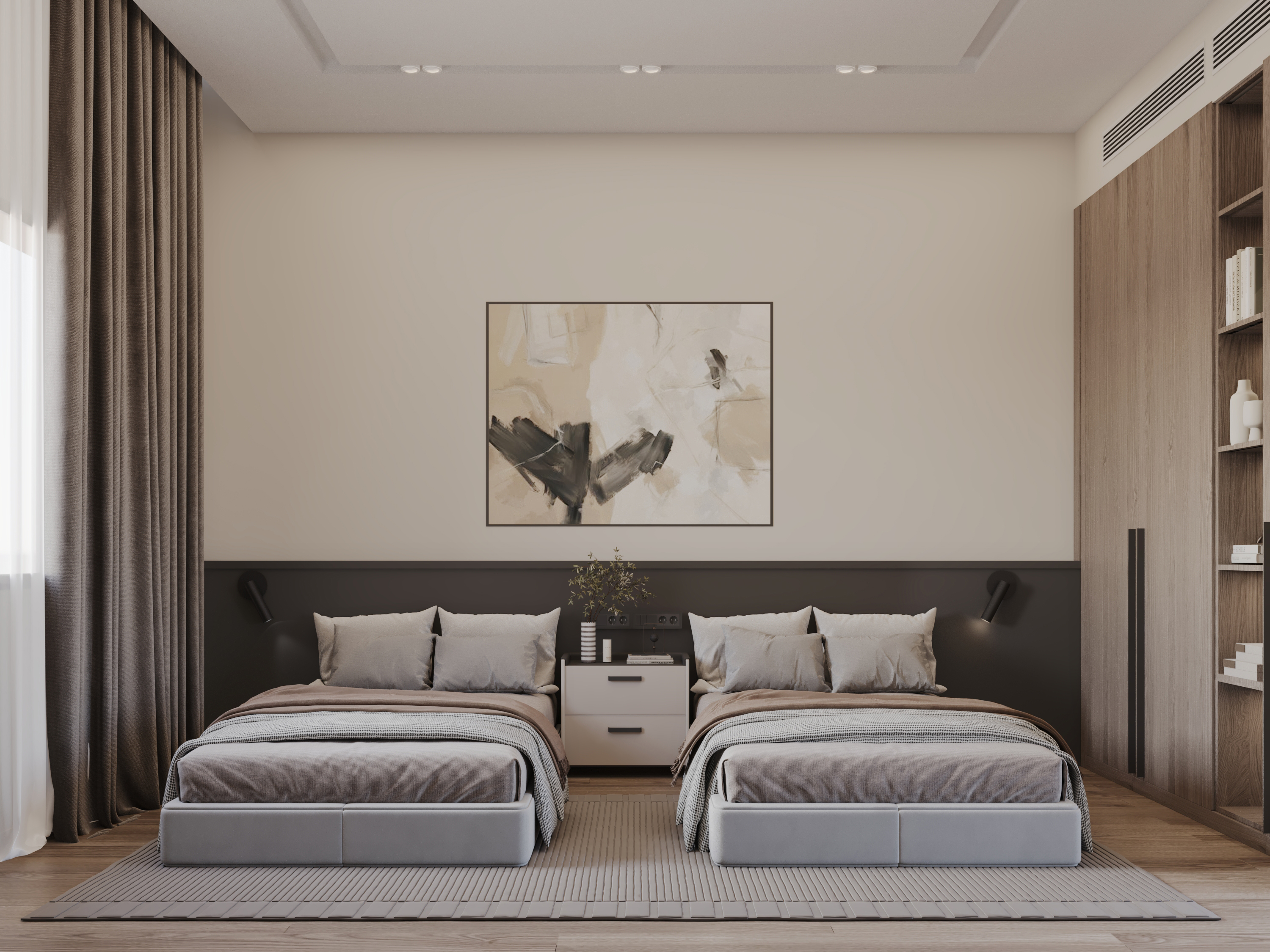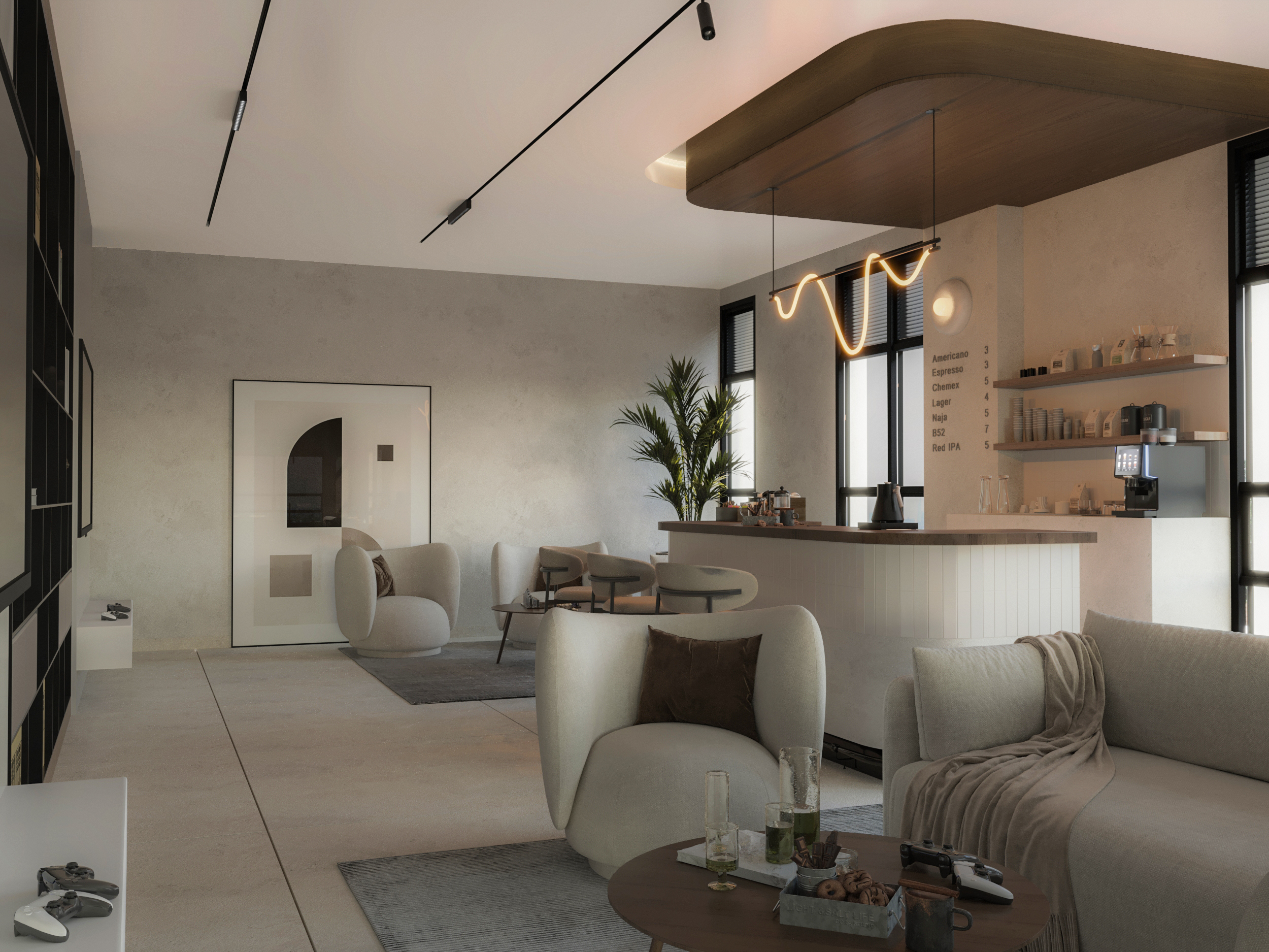 Harmony and elegance define the Al Amareah project, inspired by a boho aesthetic. A carefully curated palette of earthy tones, crisp whites, and warm beiges forms a calm and balanced foundation, enriched by green armchairs that bring life and depth to the space.