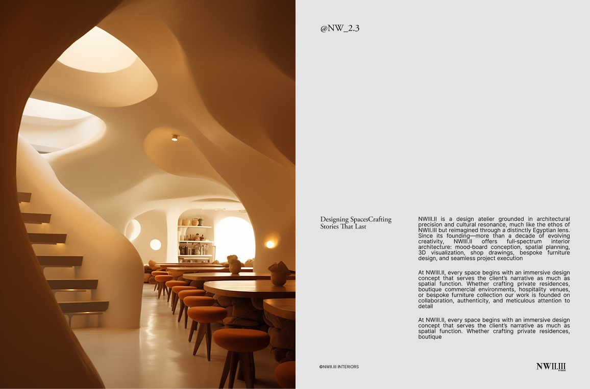 At NWIII.II, our purpose is to craft spaces that transcend aesthetics, becoming immersive experiences where architecture, design, and emotion intersect. We exist to shape environments that speak quietly but powerfully — interiors that reflect individuality, celebrate cultural roots, and embody timeless sophistication. Every project begins with a vision and ends as a space that feels both deeply personal and enduringly iconic.