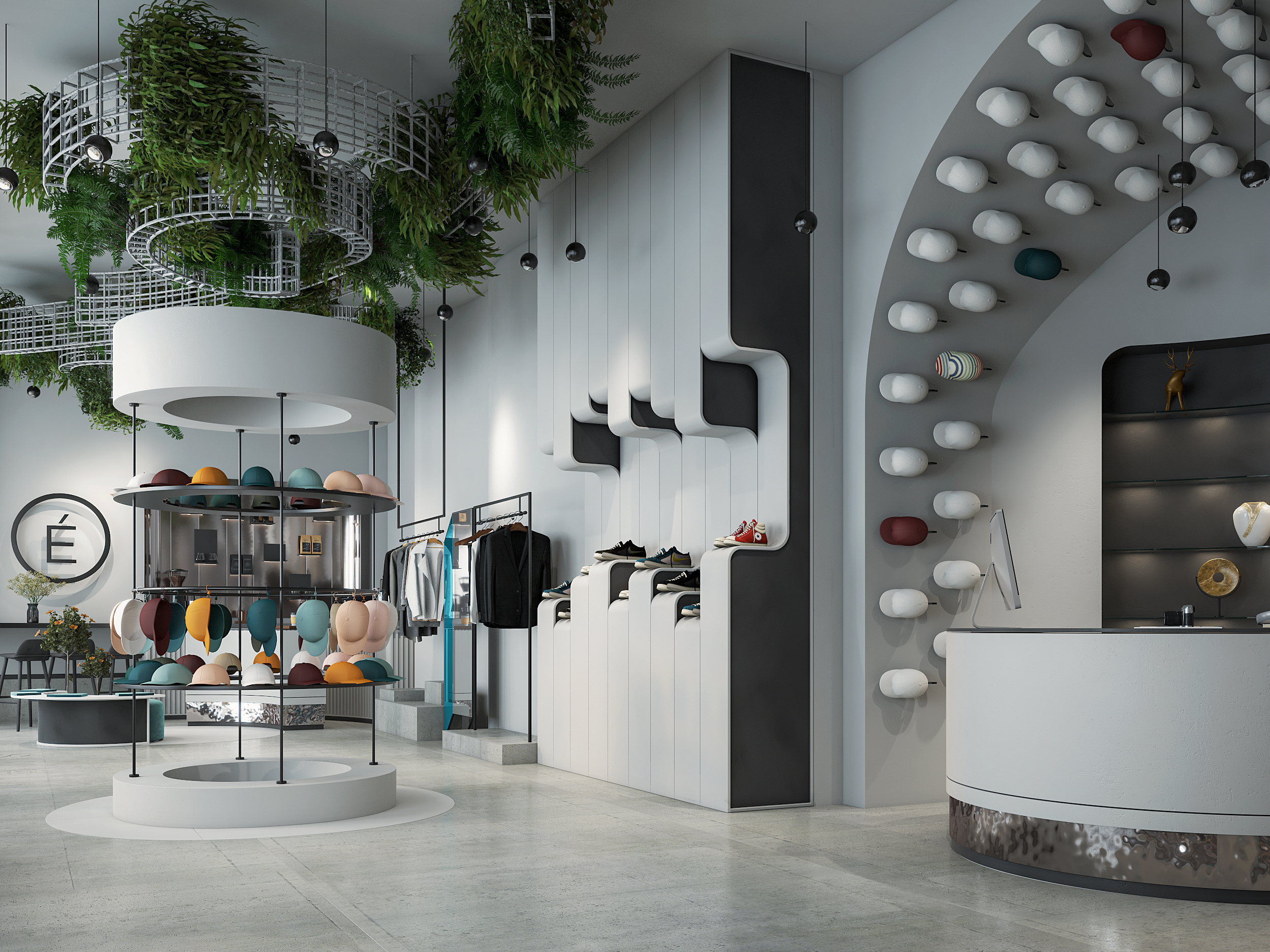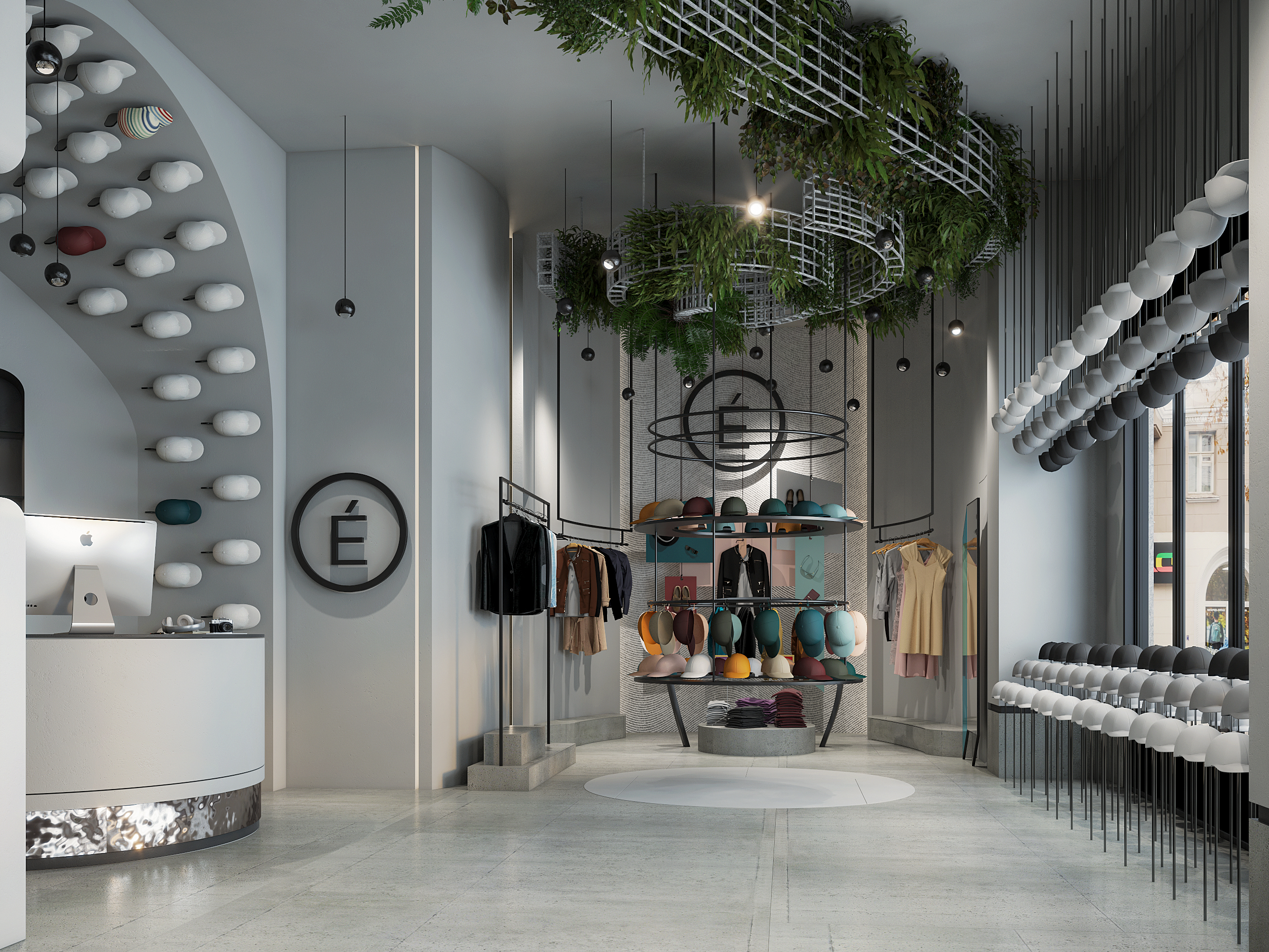 A Lifestyle Experience The interior concept translates the brand’s twisted bow, featured on their signature hat design, into architectural details, guiding the flow from entrance to lounge, multibrand displays, and the in-store coffee bar.