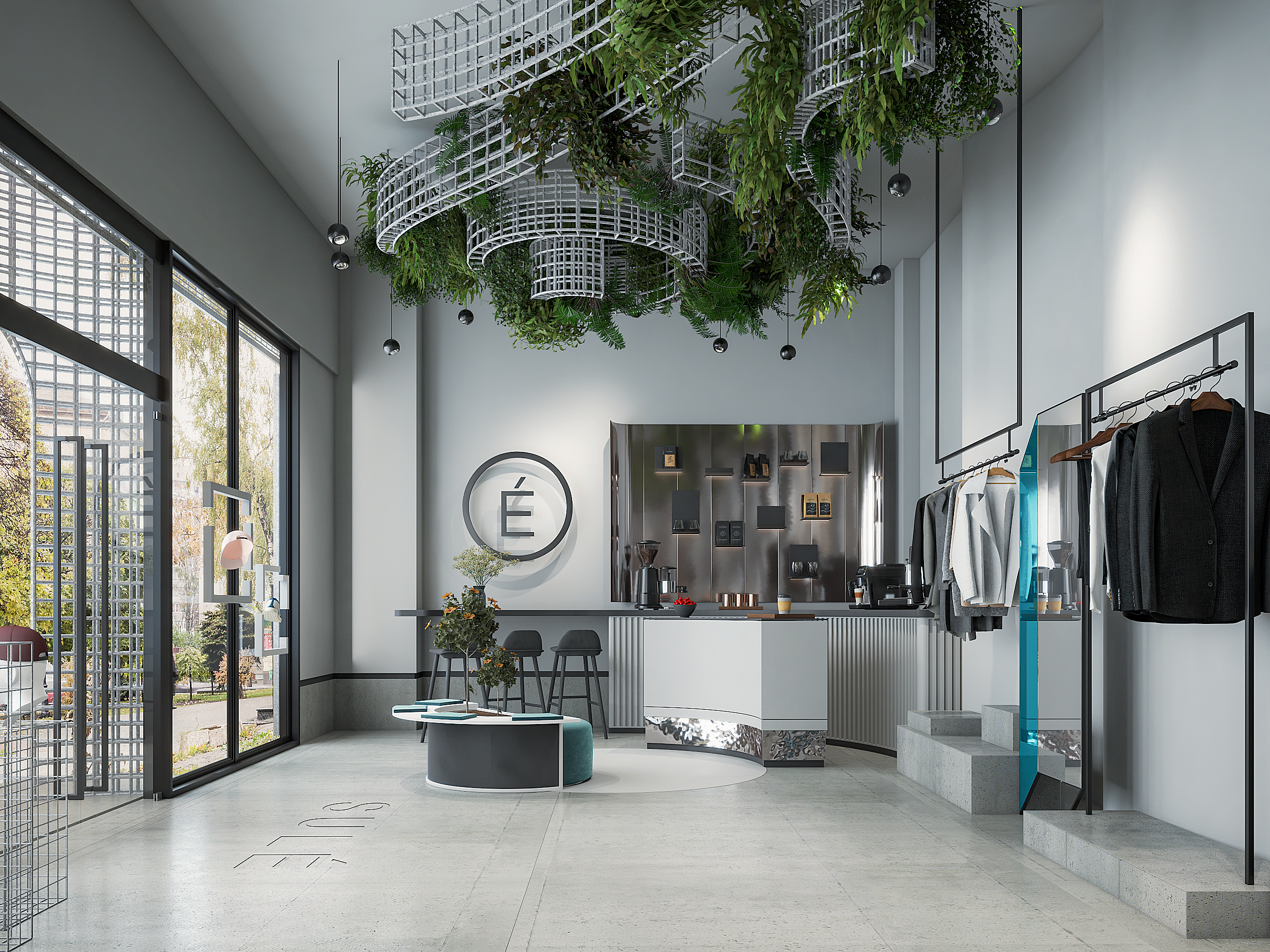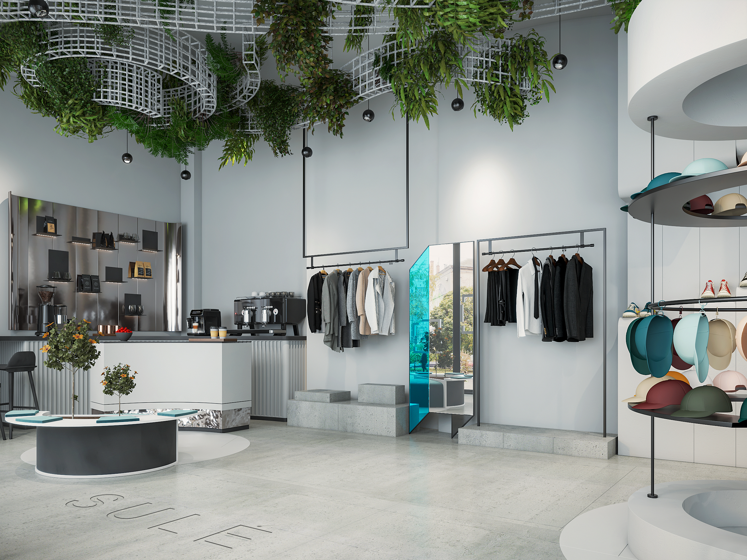 The interior concept translates the brand’s twisted bow, featured on their signature hat design, into architectural details, guiding the flow from entrance to lounge, multibrand displays, and the in-store coffee bar. Biophilic ceilings, sculptural displays, and curated art pieces shape a retail space that reflects the comfort and craftsmanship of Sulè’s loungewear.