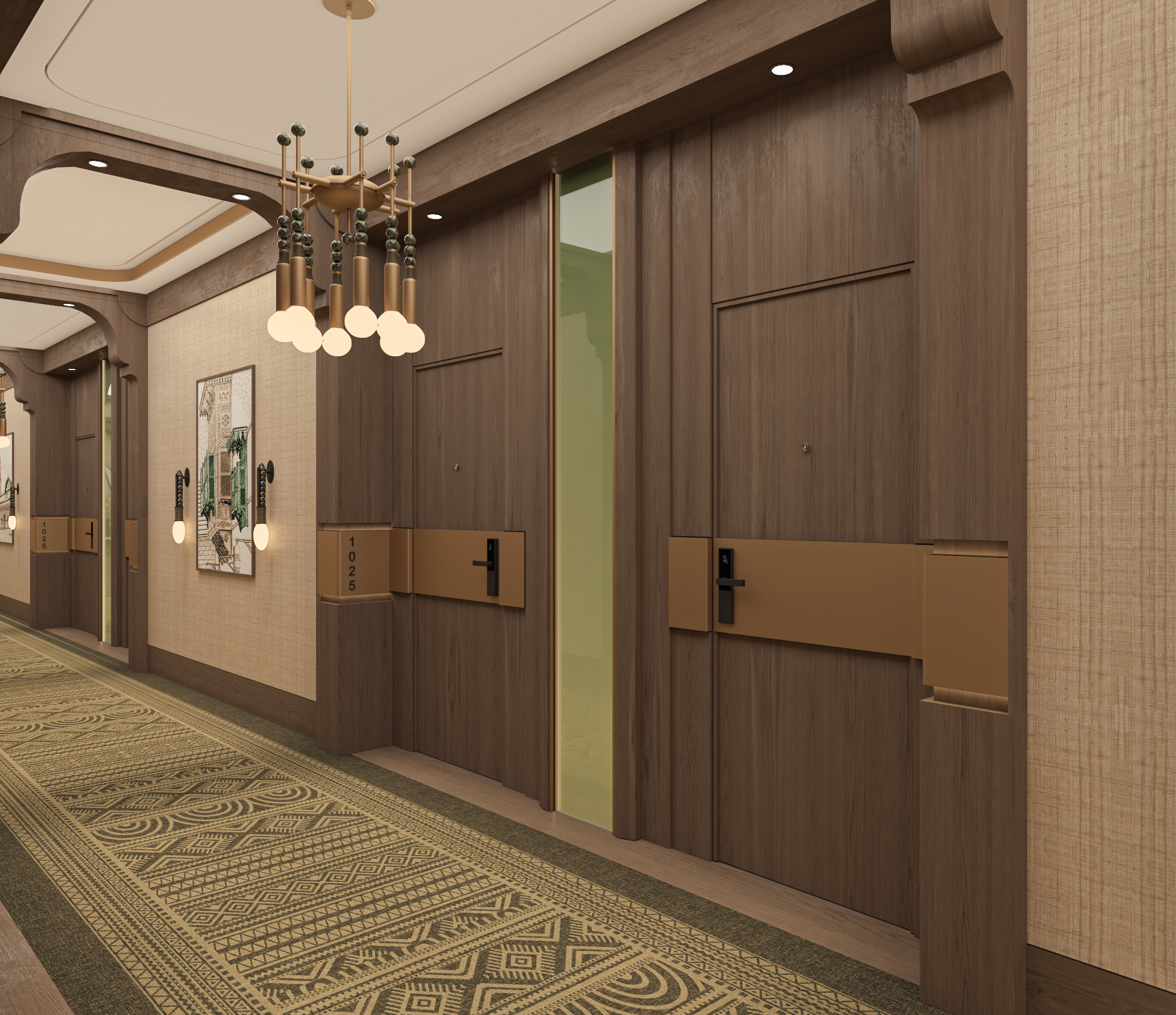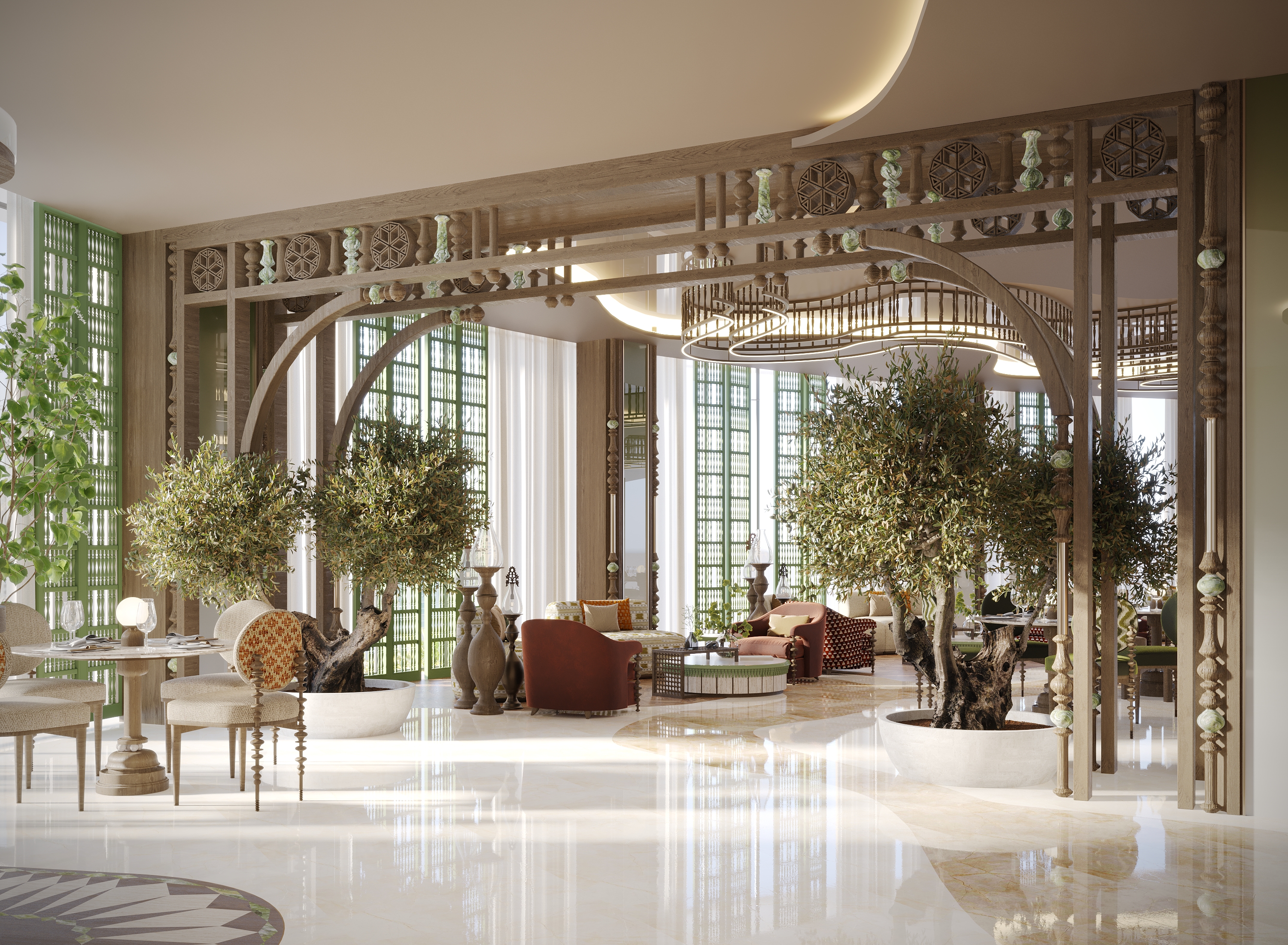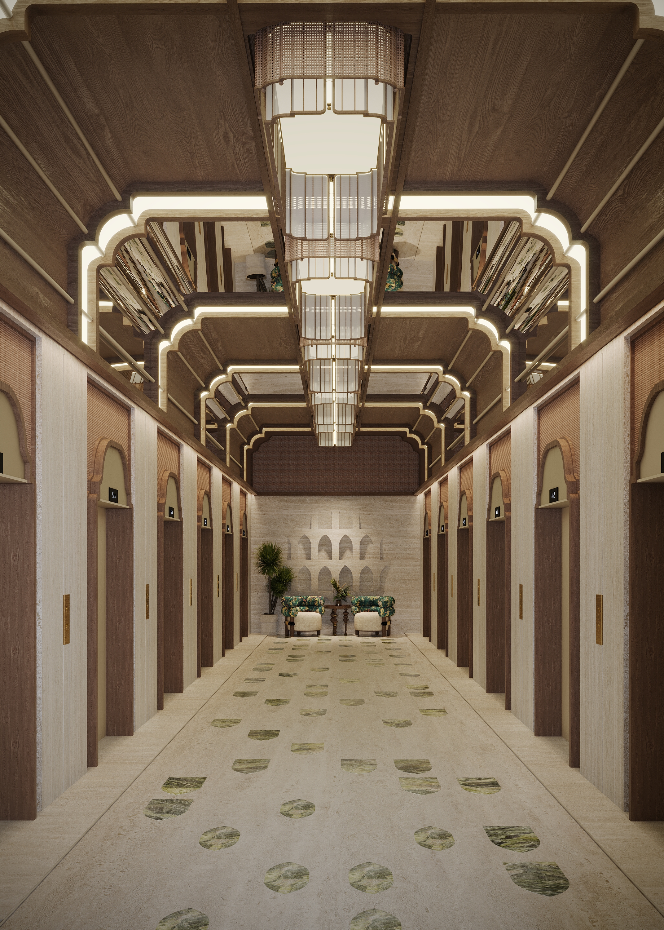 The design concept was built around the cultural richness of Najdi traditions, with a special focus on the atmosphere of traditional weddings. Patterns, textiles, and handcrafted details were integrated into the interiors, not as decoration, but as narrative elements.