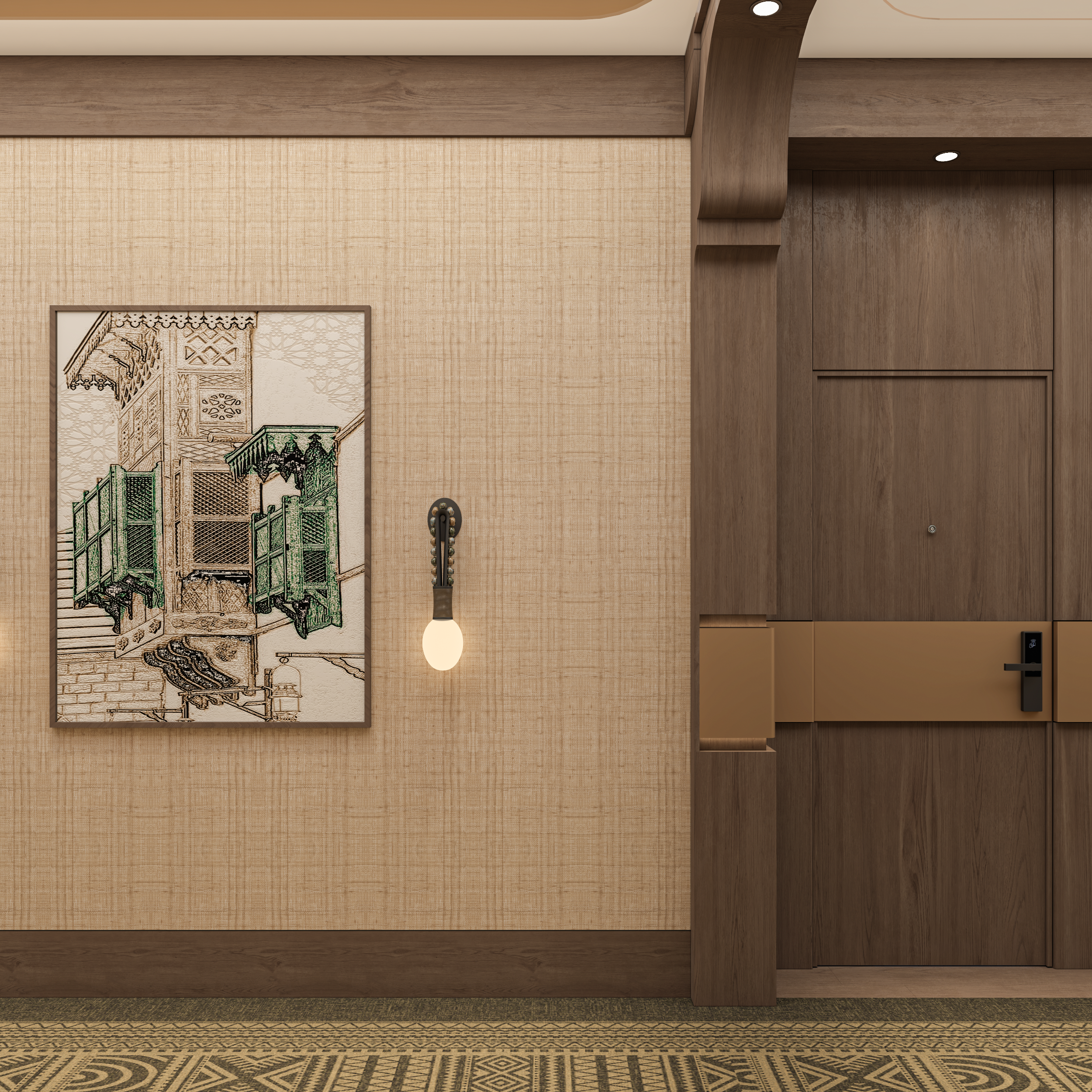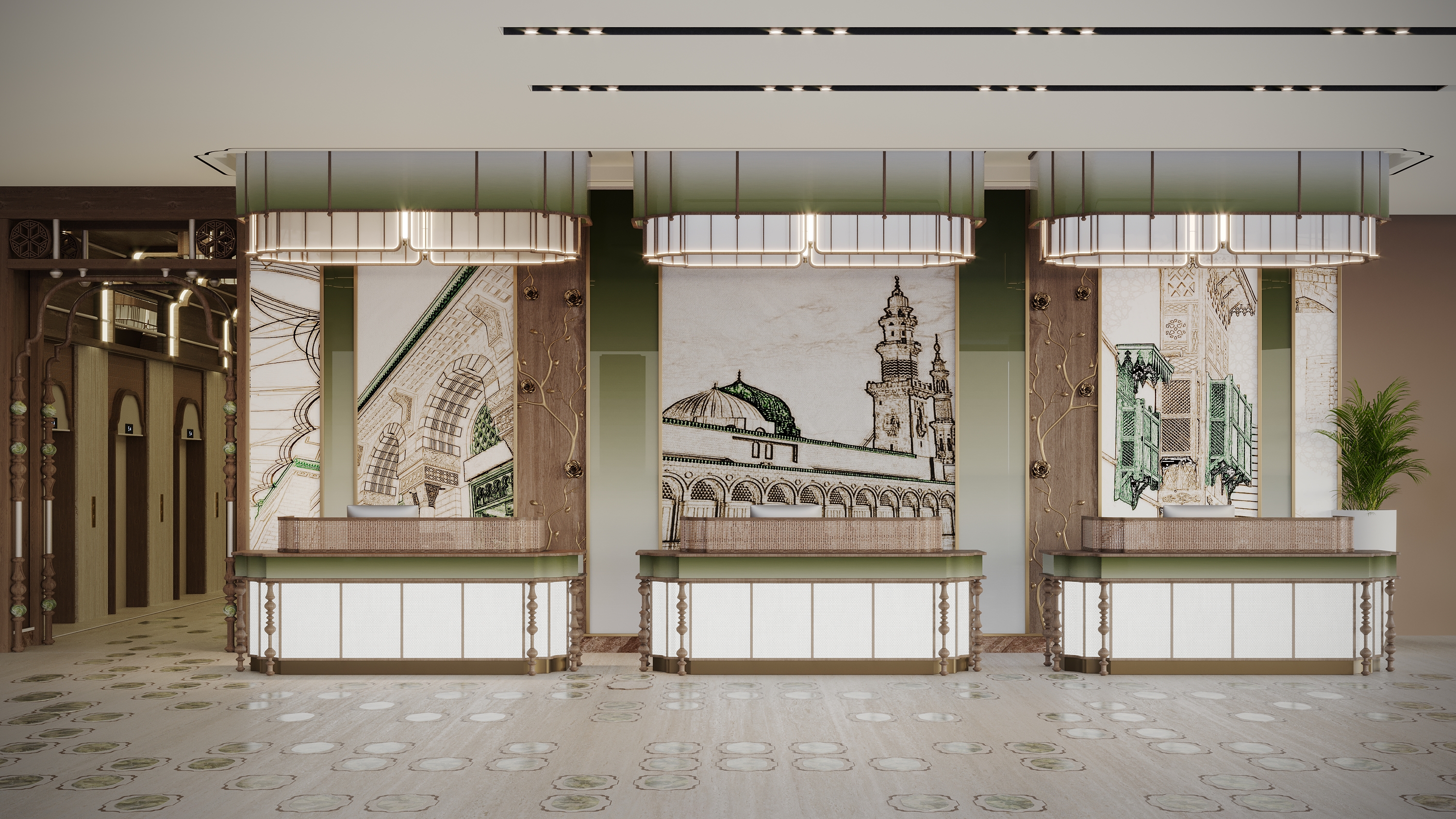 In the heart of the city, steps from the Prophet’s Mosque, this hotel draws from the sacred geometry of Ward Al Madinah, the quiet beauty of traditional mashrabiya, and the spiritual presence of the Mosque’s green dome. Each interior window facing the atrium is framed with unique latticework, echoing the individuality of every home in Al Madinah.