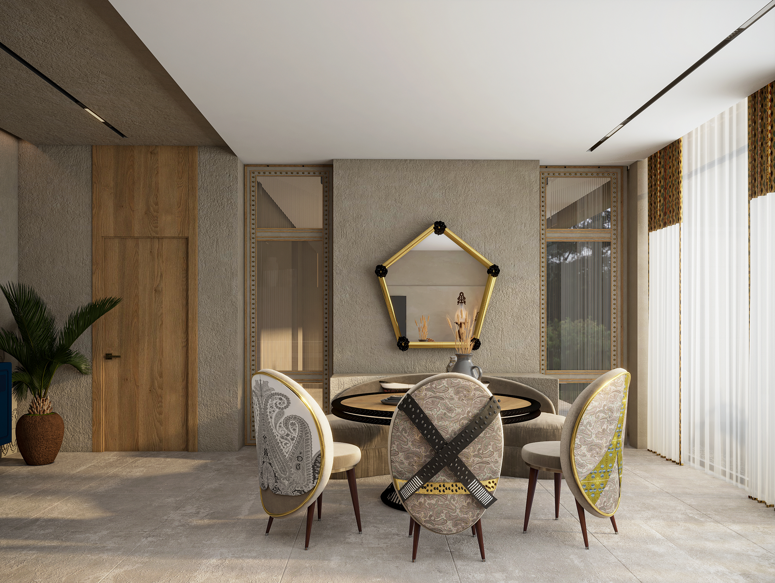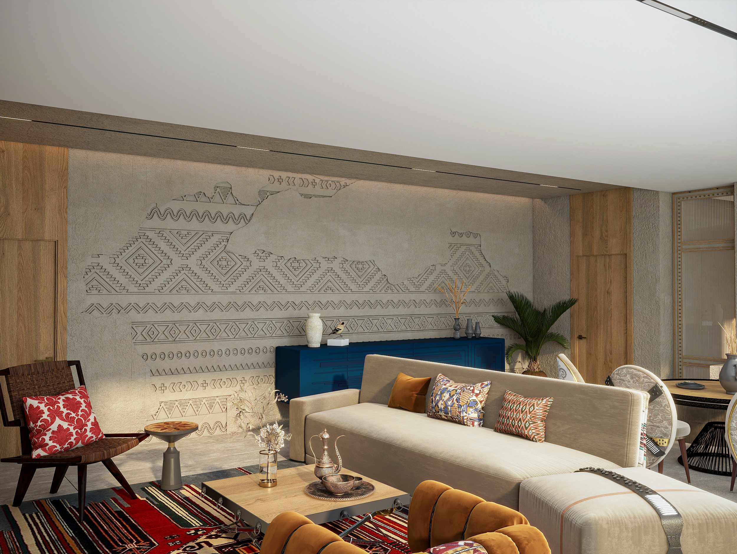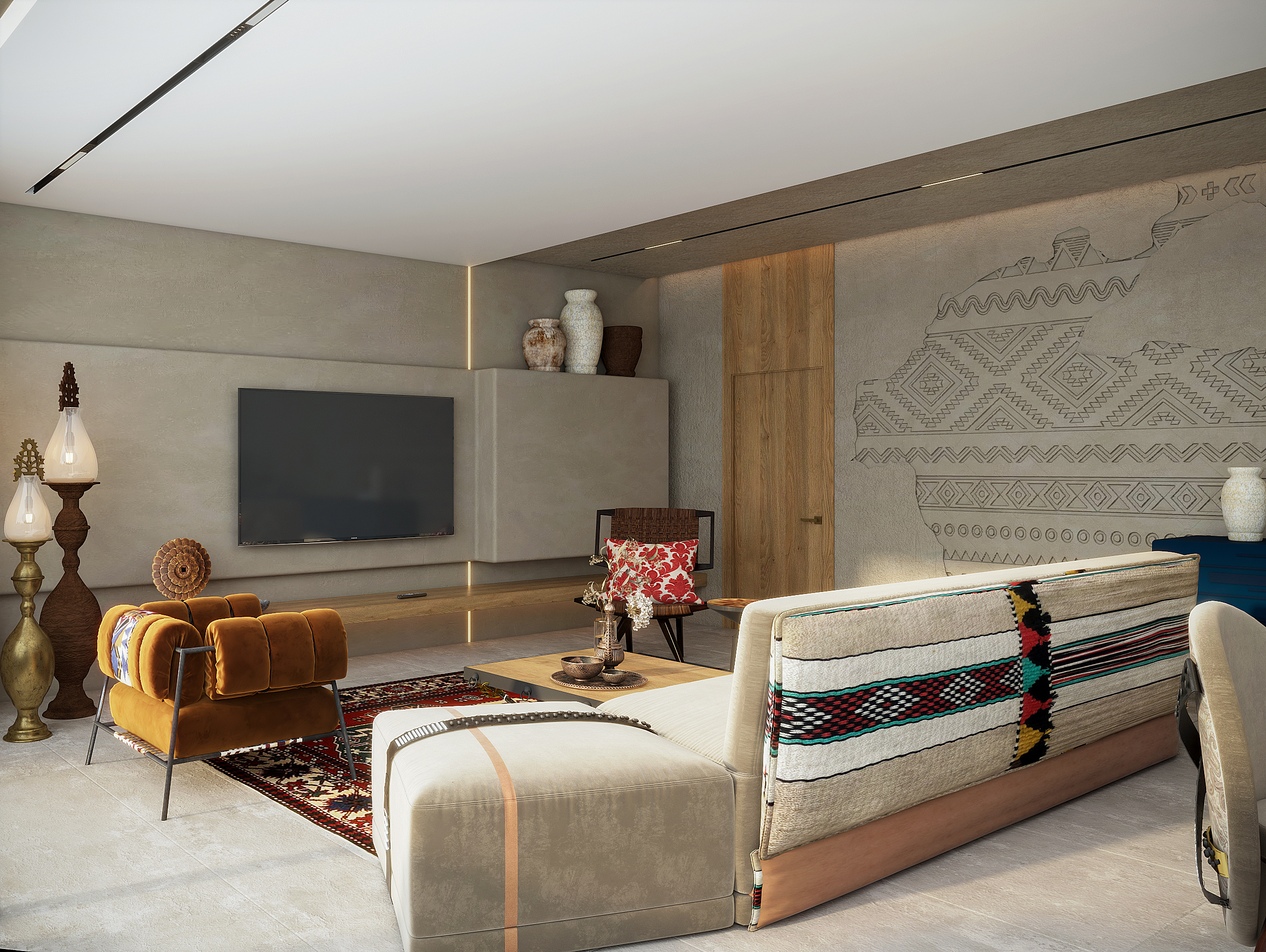 The design concept was built around the cultural richness of Najdi traditions, with a special focus on the atmosphere of traditional weddings. Patterns, textiles, and handcrafted details were integrated into the interiors, not as decoration, but as narrative elements. Each space balances natural textures, warm wood, and bold fabrics, creating a contemporary resort villa that remains authentic to its heritage while offering the comfort and sophistication expected in modern hospitality.