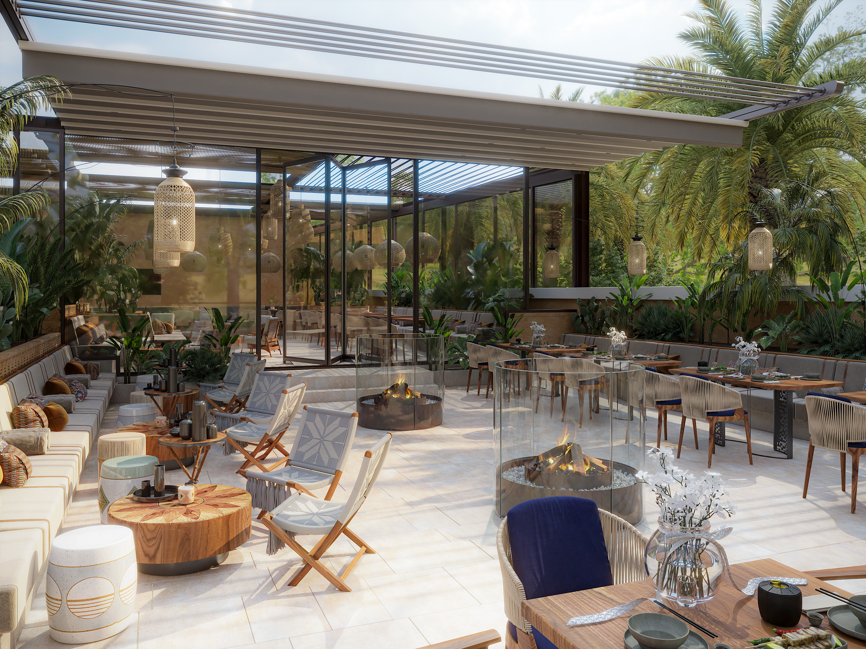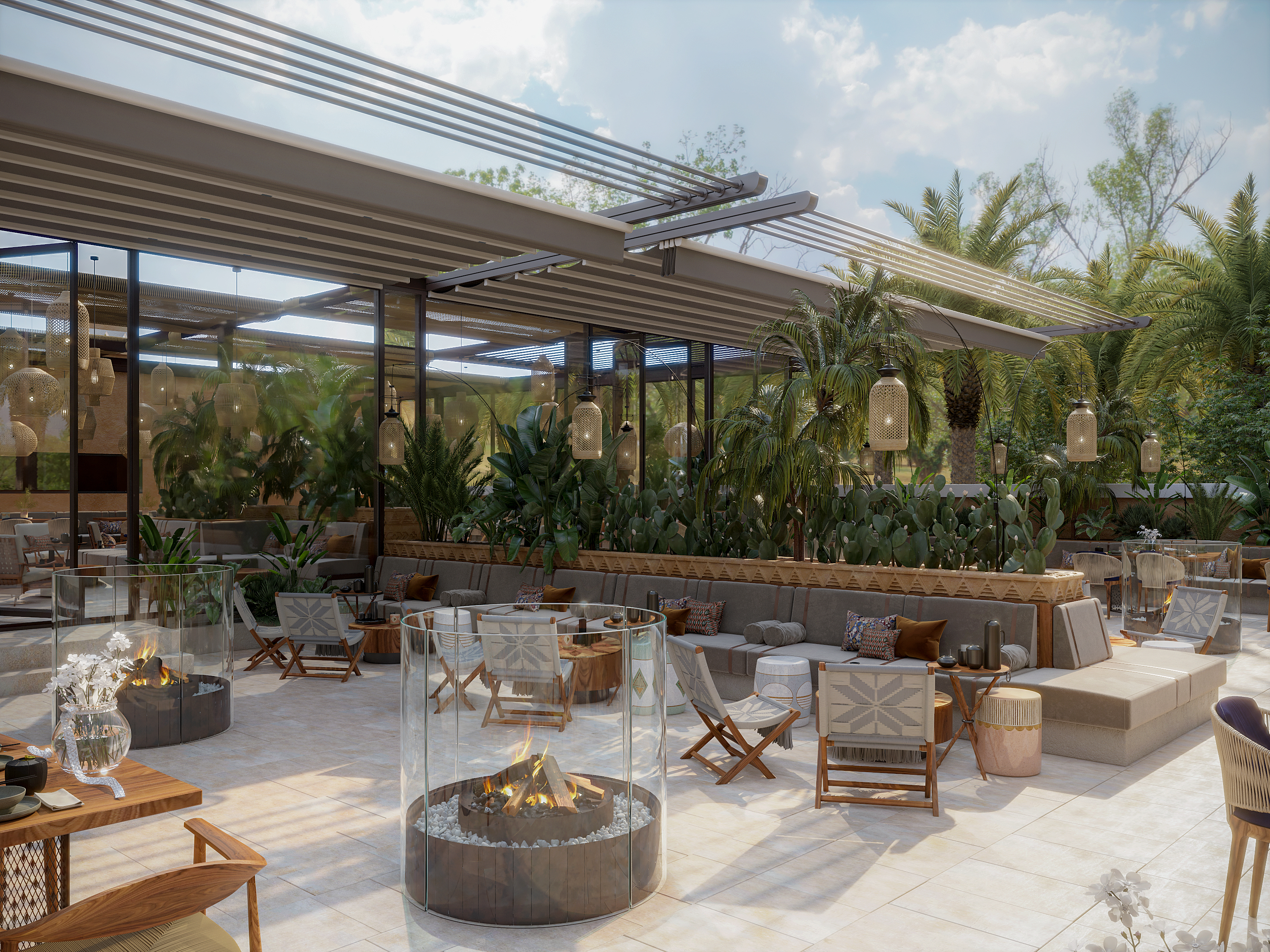 The rooftop bar is the heart of the project. Designed with Salmani sensibilities, it blends Saudi ornamentation with Mediterranean clarity, creating a centerpiece of texture, form, and identity.