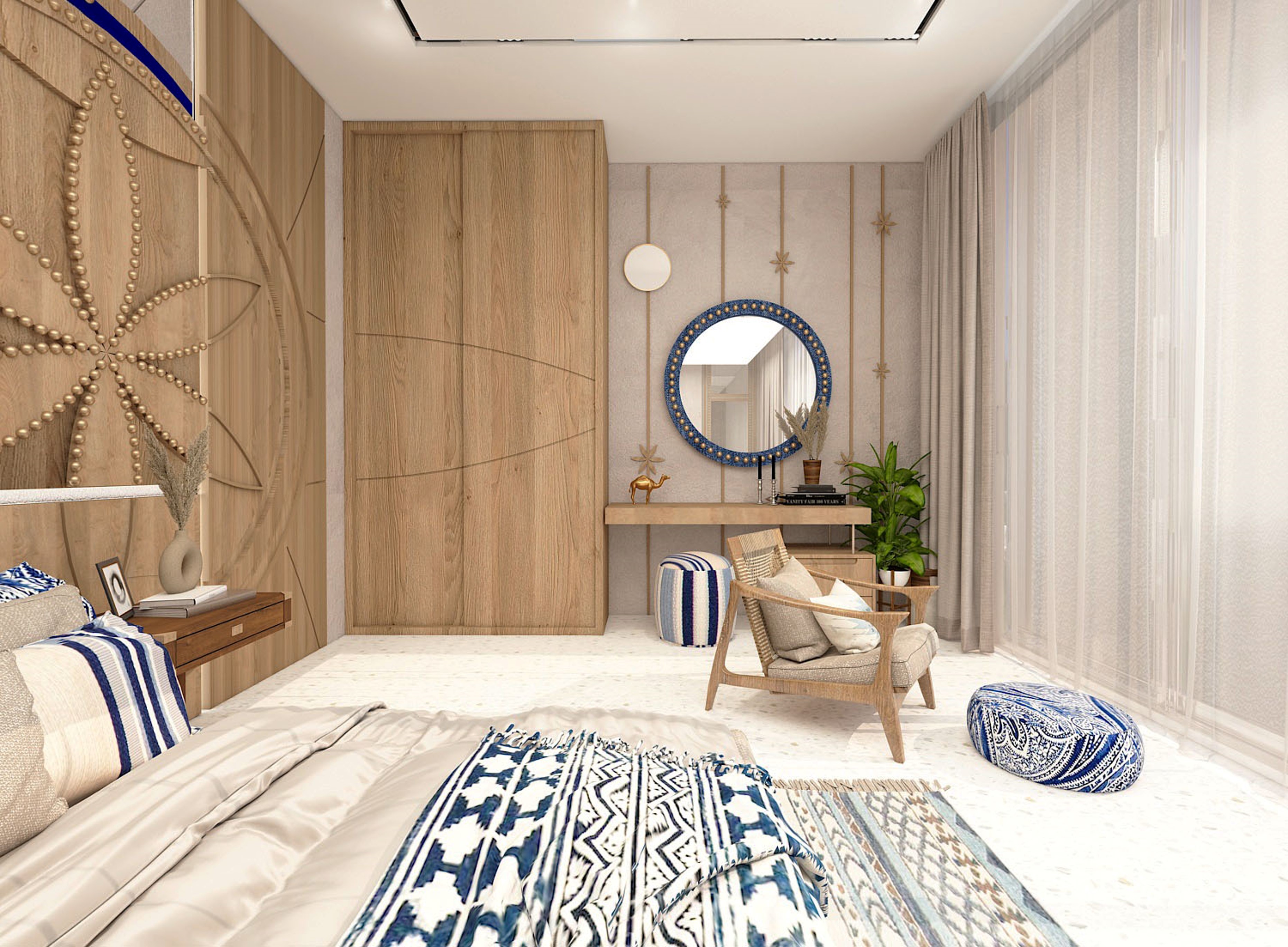 Harmony and elegance define the Al Amareah project, inspired by a boho aesthetic. A carefully curated palette of earthy tones, crisp whites, and warm beiges forms a calm and balanced foundation, enriched by green armchairs that bring life and depth to the space.