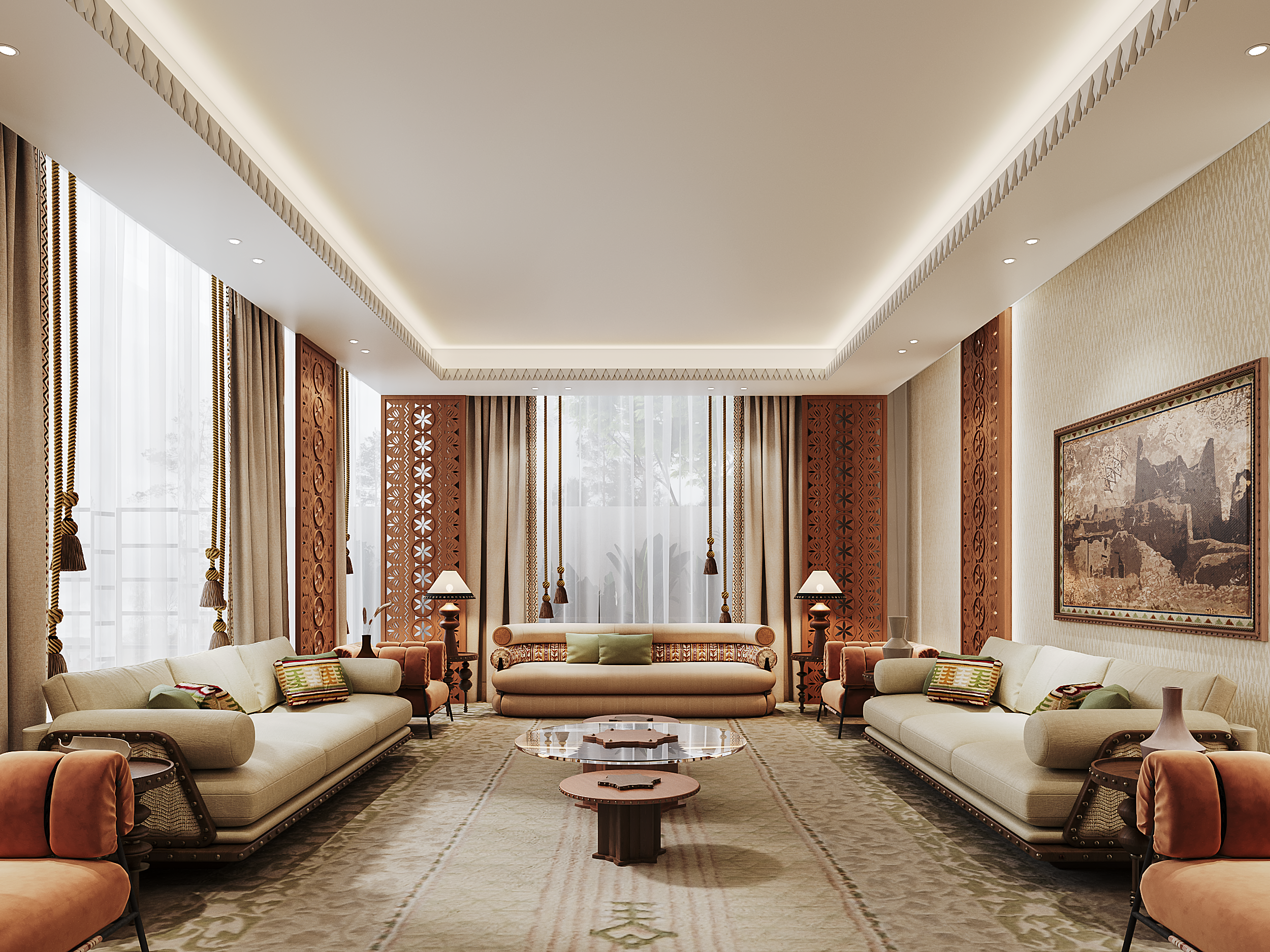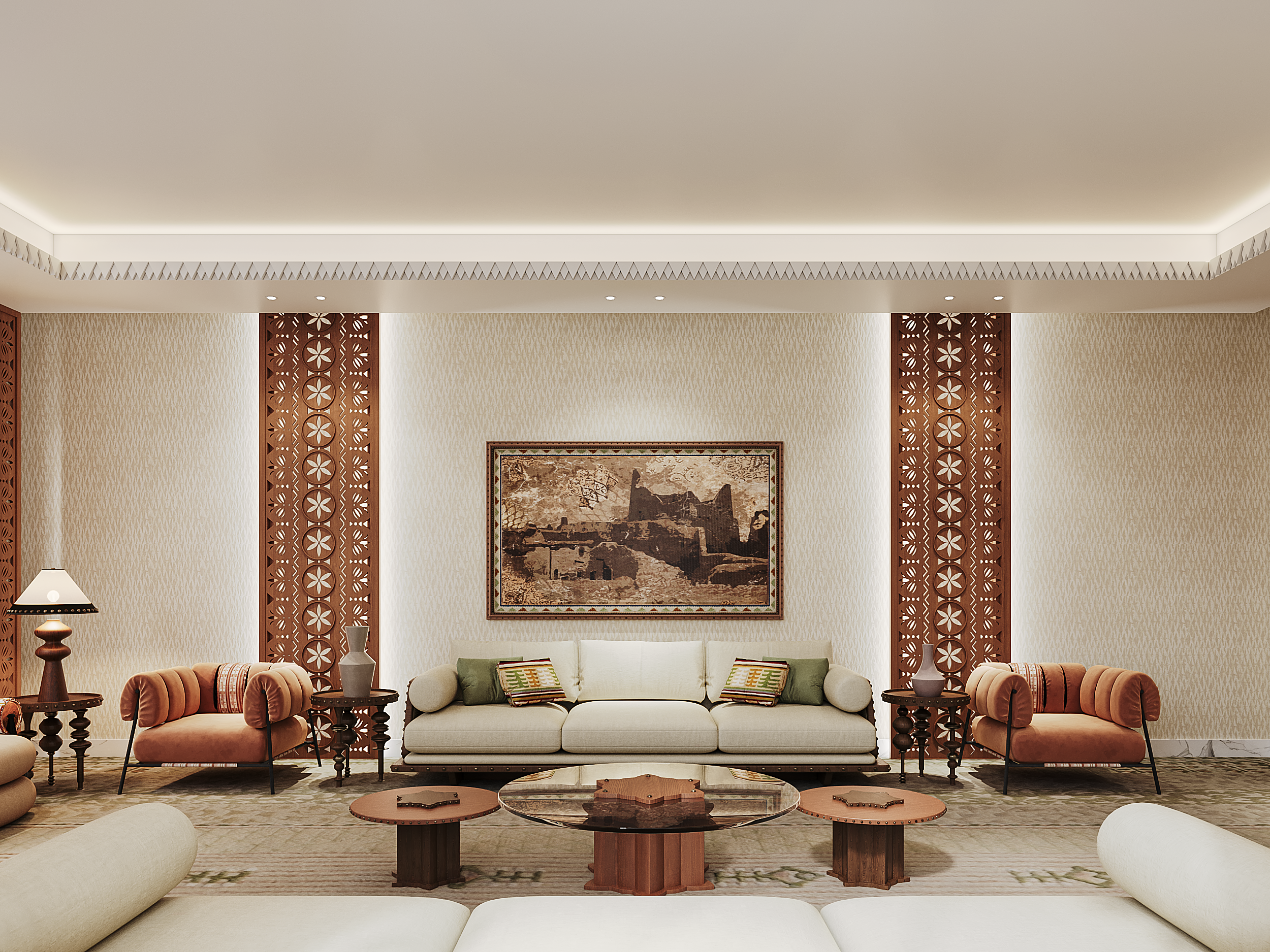 The design concept was built around the cultural richness of Najdi traditions, with a special focus on the atmosphere of traditional weddings. Patterns, textiles, and handcrafted details were integrated into the interiors, not as decoration, but as narrative elements.