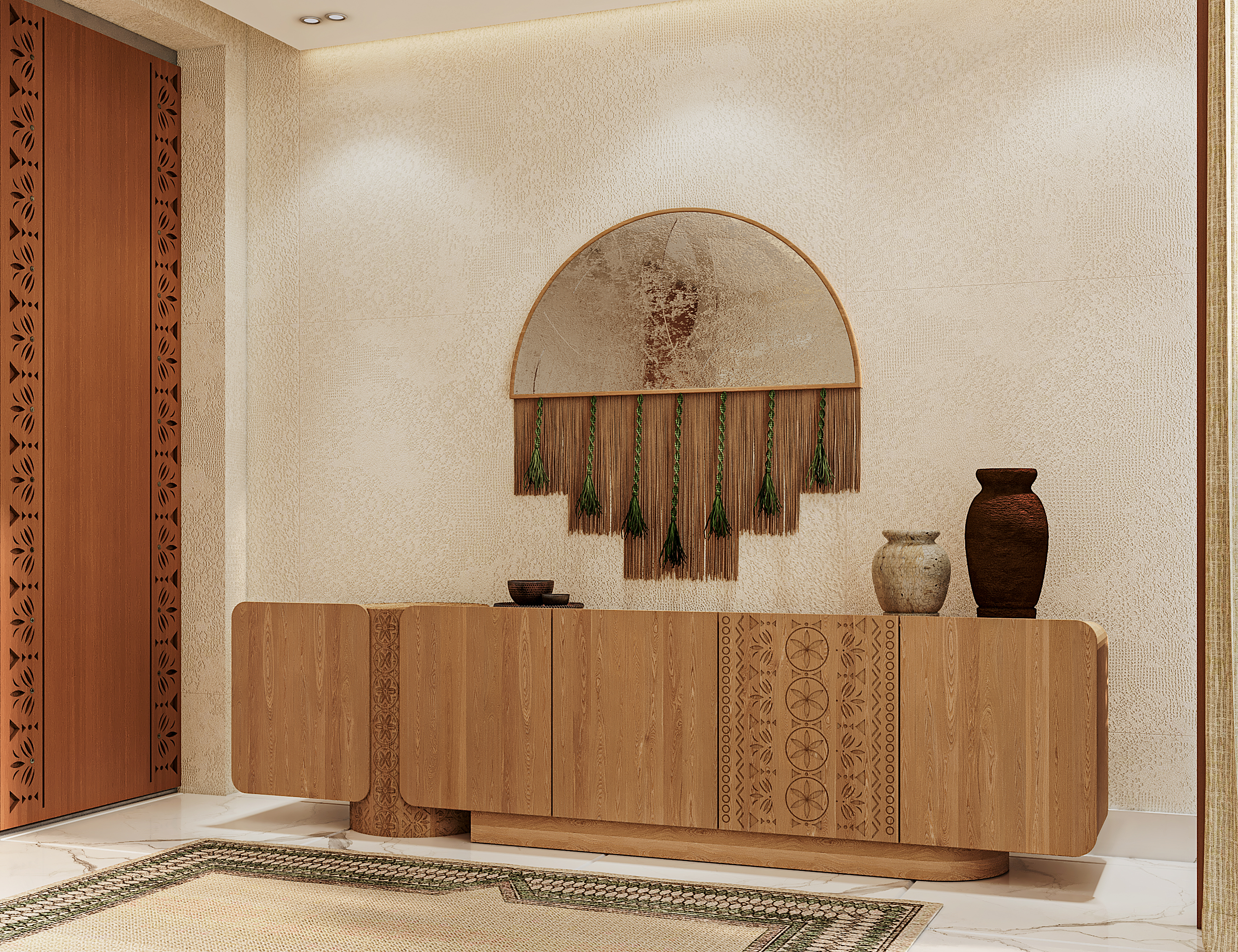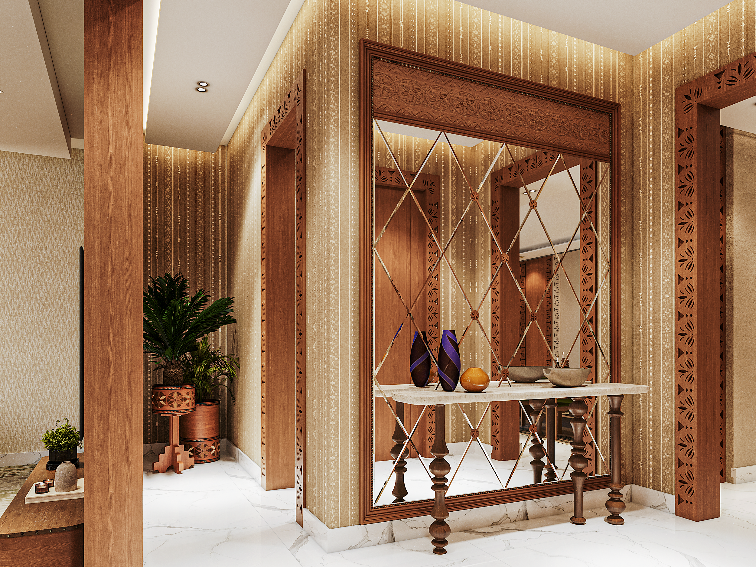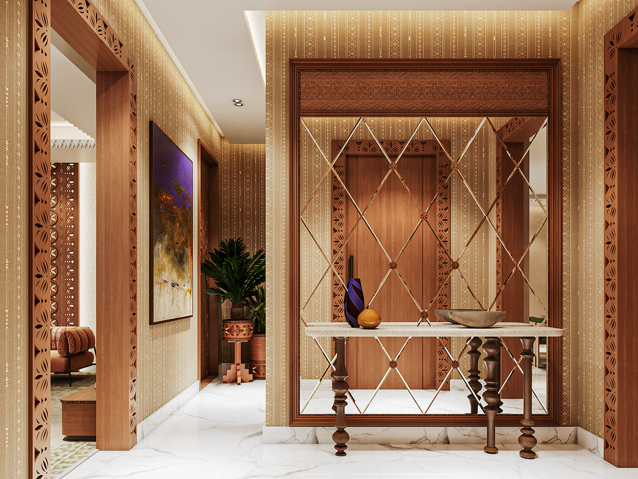 The entry was visually expanded through decorative mirrors framed in a custom modern Najdi wooden pattern designed exclusively for the project. Carefully layered lighting enhances depth and brightness, while the wallpaper supports the cultural tone in a subtle, balanced way.