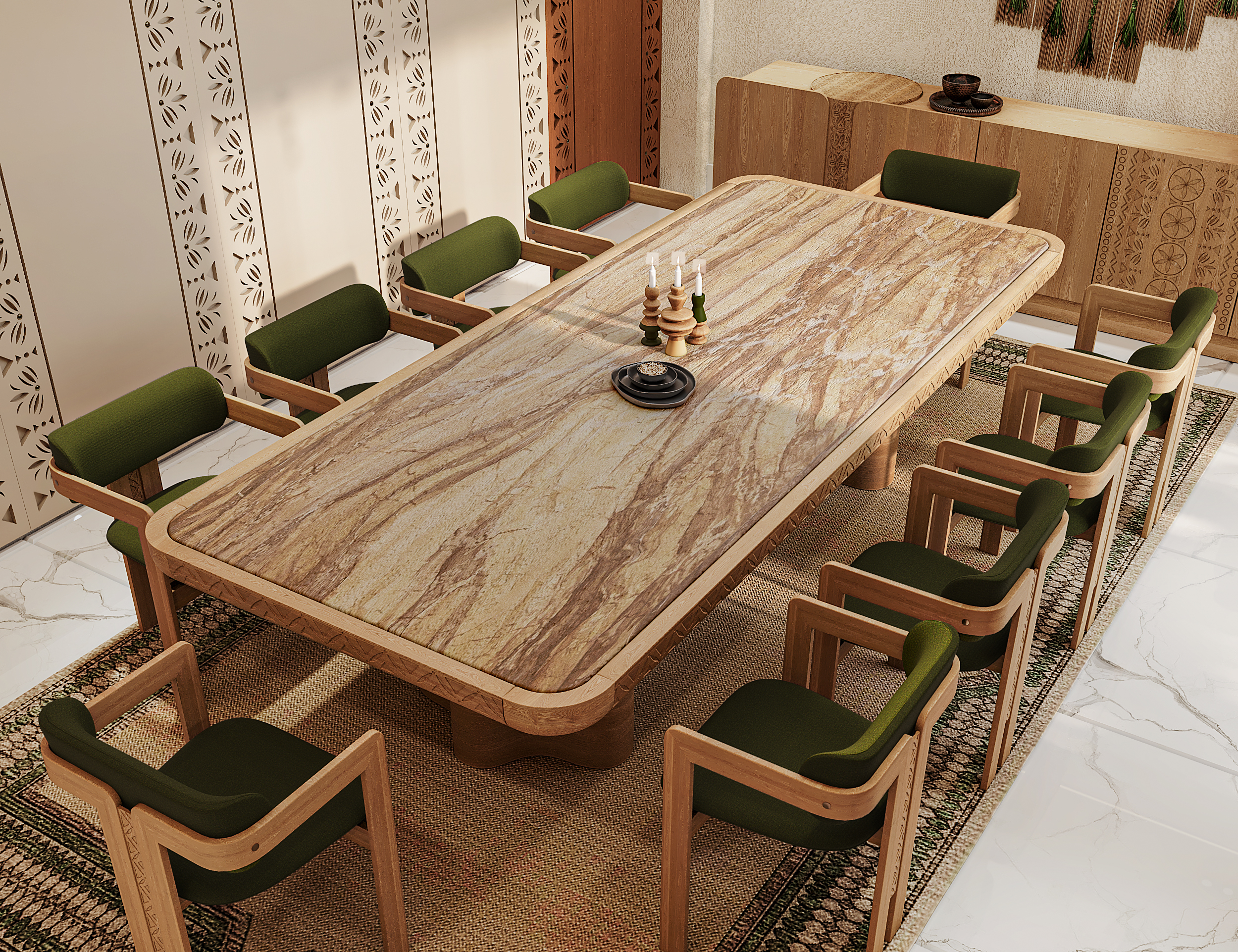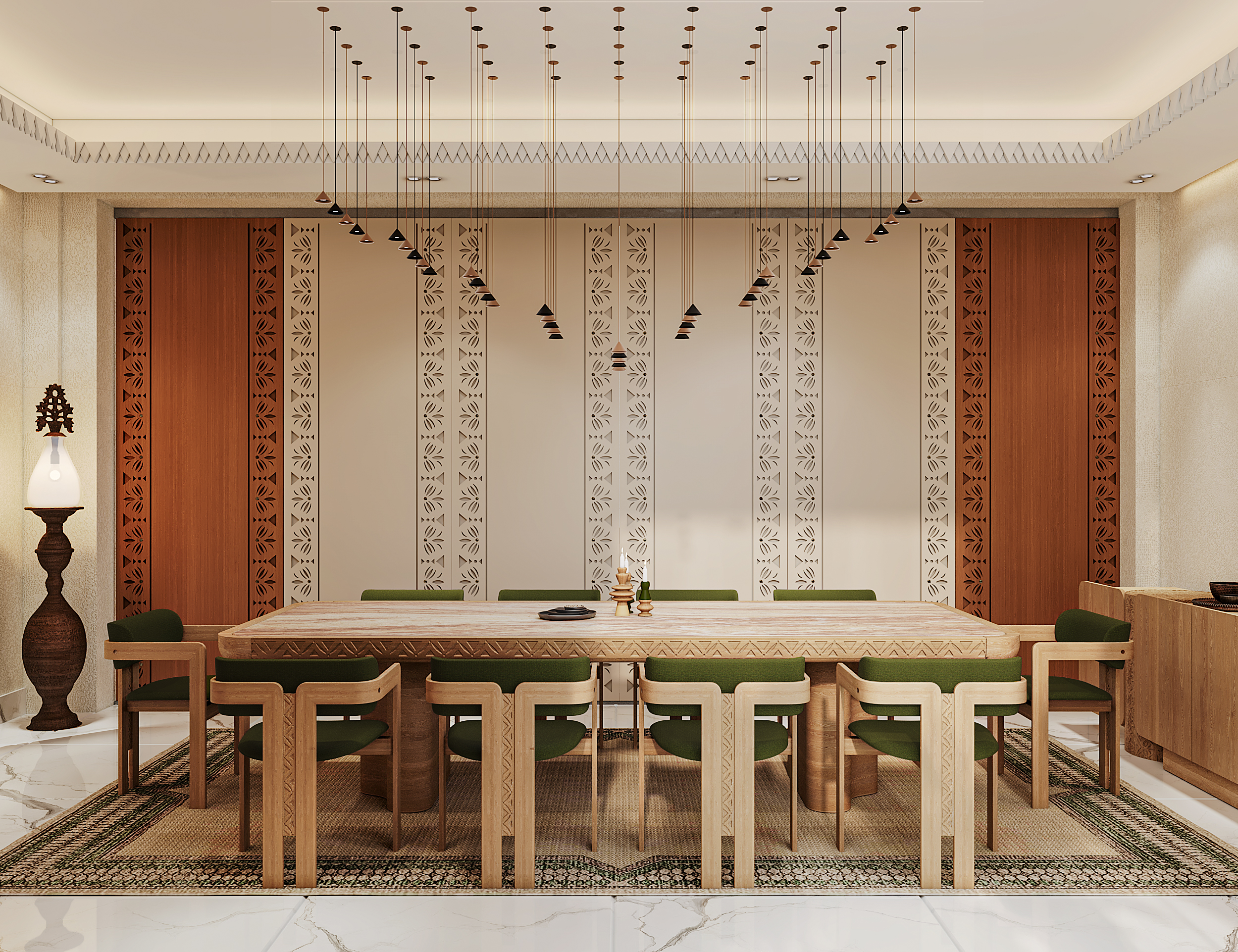 Harmony and elegance define the Al Amareah project, inspired by a boho aesthetic. A carefully curated palette of earthy tones, crisp whites, and warm beiges forms a calm and balanced foundation, enriched by green armchairs that bring life and depth to the space.