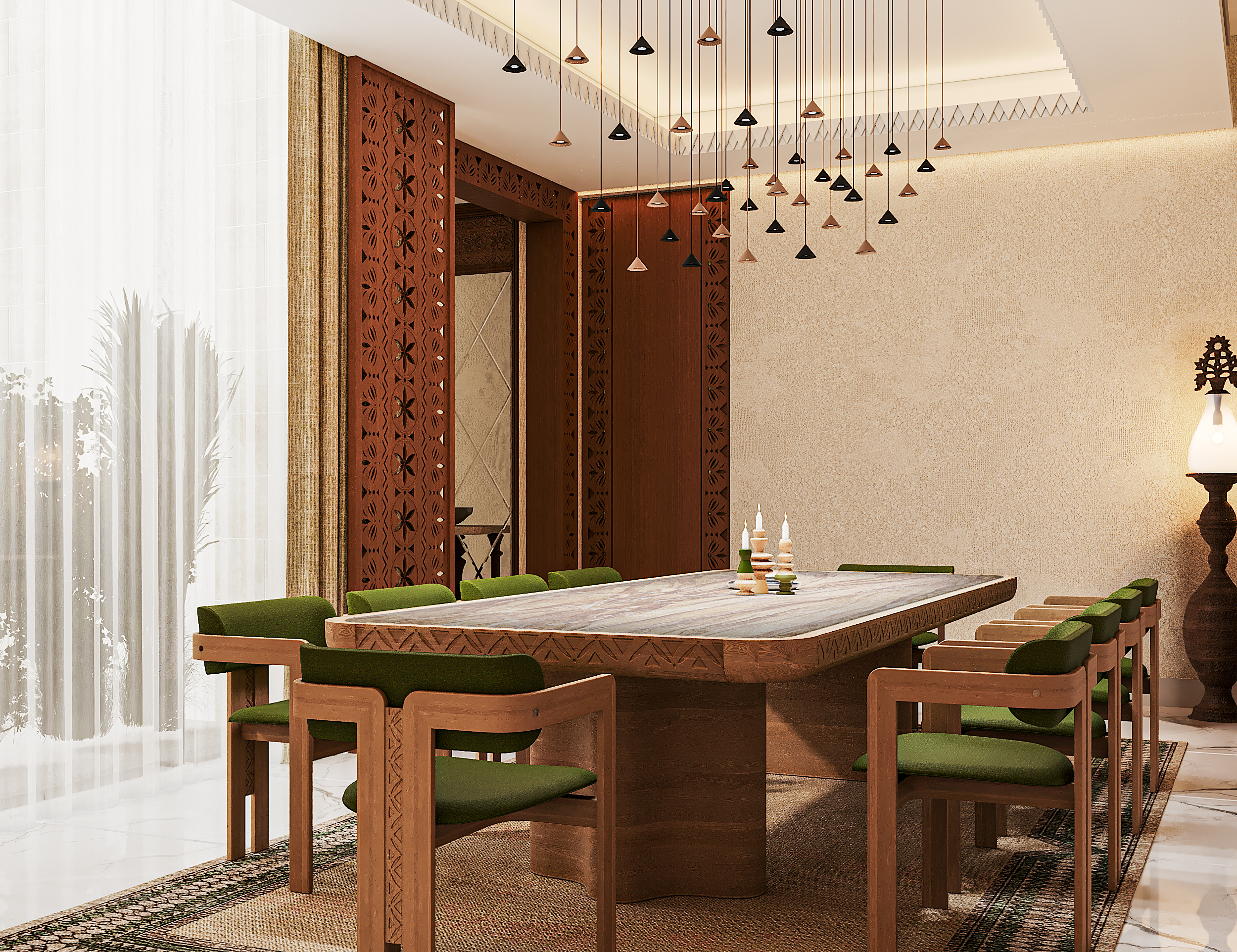 The majlis is anchored by a bespoke CNC pattern developed specifically to give the space a clear identity. The same language extends to coffee tables, door frames, and a custom-designed rug — creating rhythm and continuity across the room. Modern furniture silhouettes are complemented by understated traditional touches in fabric and detailing, achieving a calm balance between heritage and contemporary luxury.