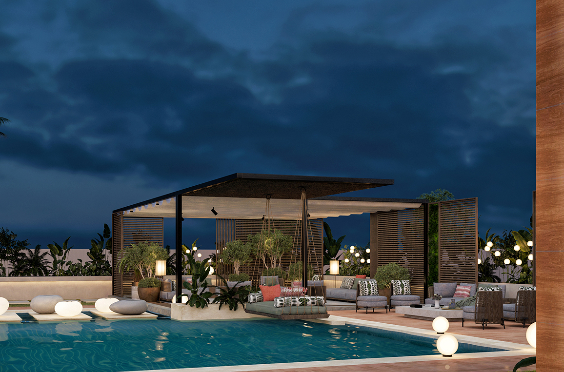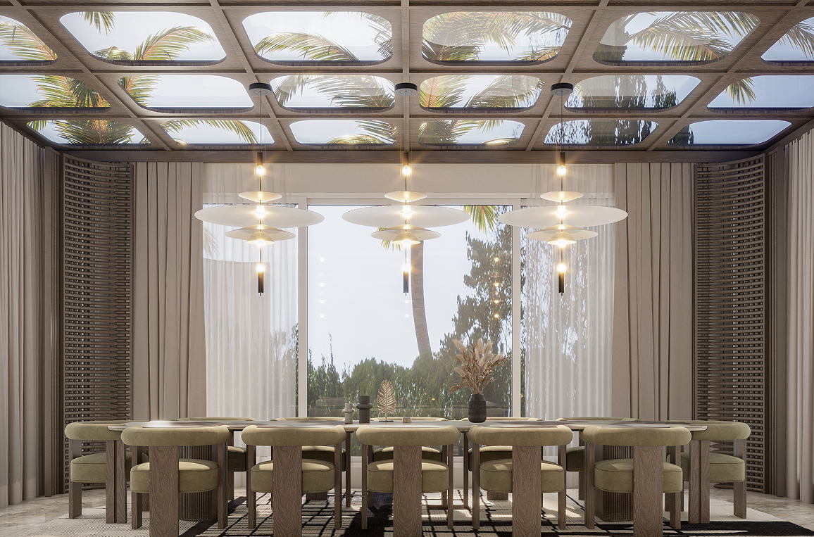 Our team developed detailed spatial plans, material palettes, and bespoke furniture concepts, ensuring every texture and finish felt rooted in nature. Polished plaster walls, warm timber details, and locally sourced stone brought depth and tactility, while custom lighting accentuated the villa’s sculptural qualities.