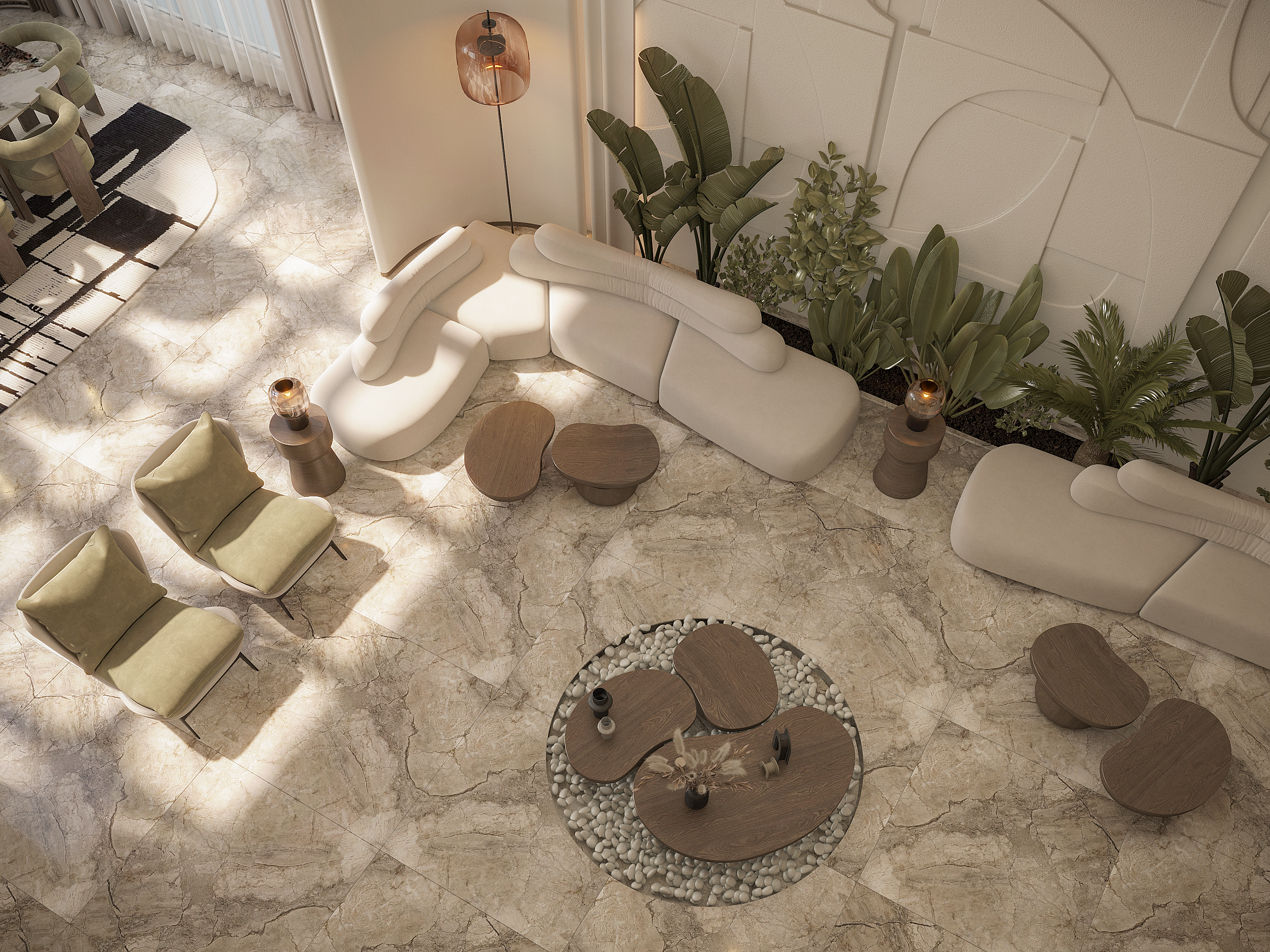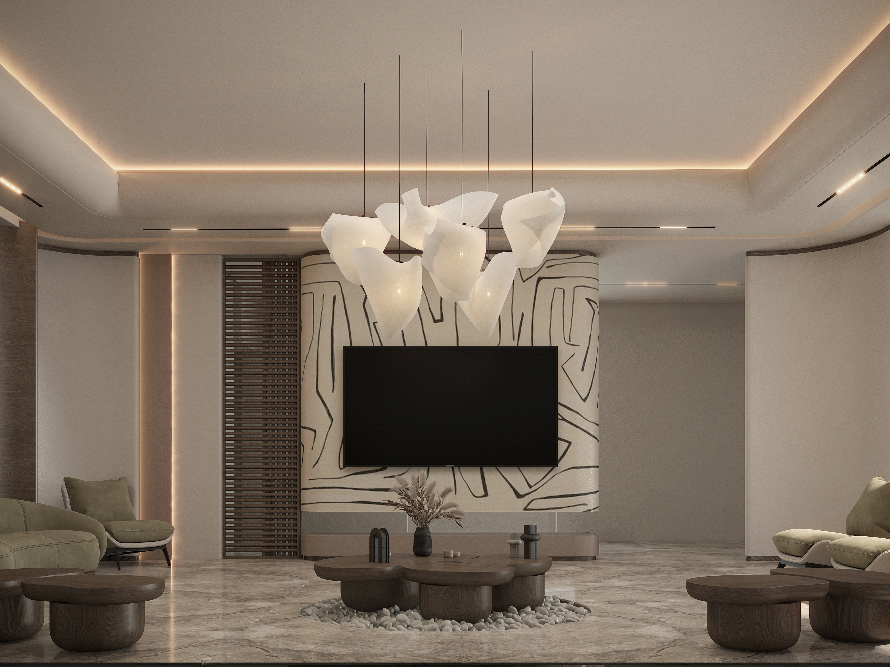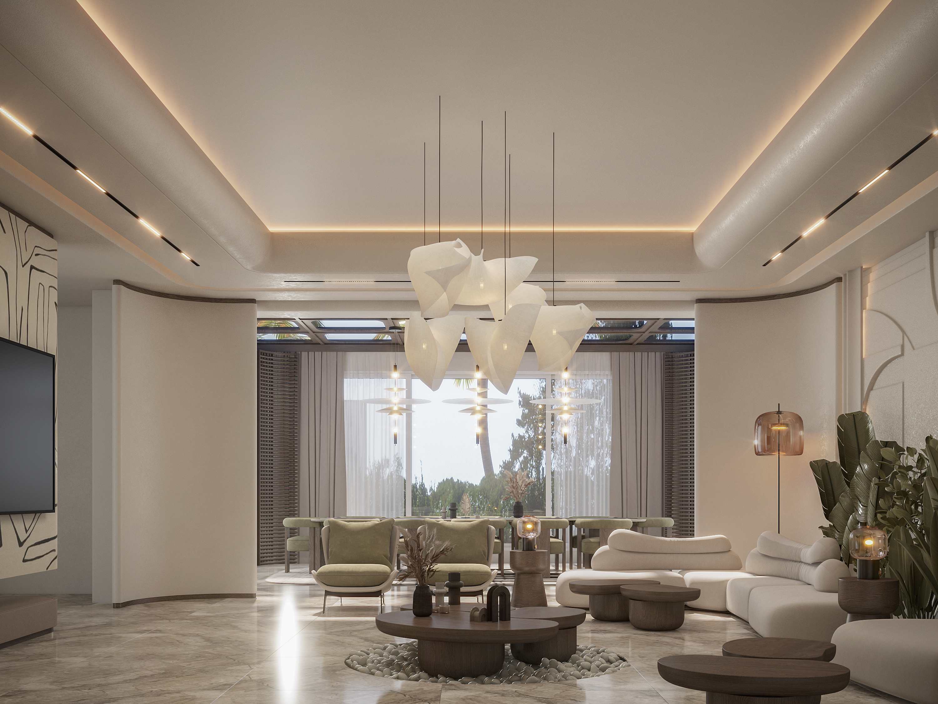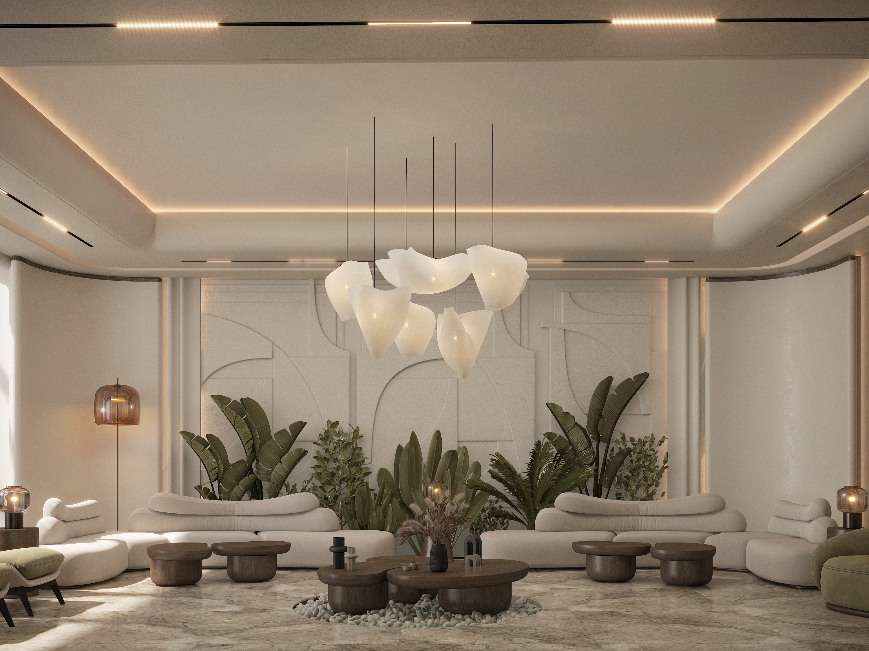Harmony and elegance define the Al Amareah project, inspired by a boho aesthetic. A carefully curated palette of earthy tones, crisp whites, and warm beiges forms a calm and balanced foundation, enriched by green armchairs that bring life and depth to the space. Curvilinear forms flow throughout the design, celebrating the softness and authenticity of organic shapes and creating an atmosphere of serene, refined comfort.